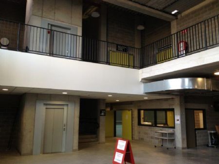 In de voorgevel zijn dezelfde krachttermen doorgetrokken. Bovendien werd in de voorgevel een lange luifel geplaatst die het overdekt binnenkomen bevordert vanaf de parking en die als uithangbord kan dienen voor de sporthal met een eventuele benaming met logo erop. Het uitspringende kleedkamervolume krijgt een extra uitnodigende functie door de bekleding met plycarbonaatplaten met inbouw van indirecte verlichting. Deze geeft ’s avonds ook een speels uitnodigend karakter en leidt de bezoeker op een aangename wijze van de parking naar de inkom.
