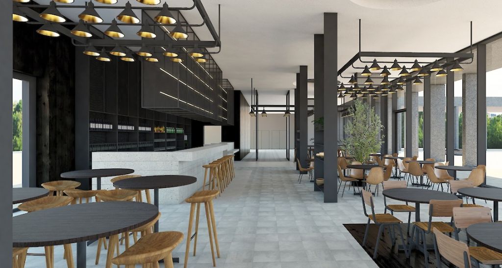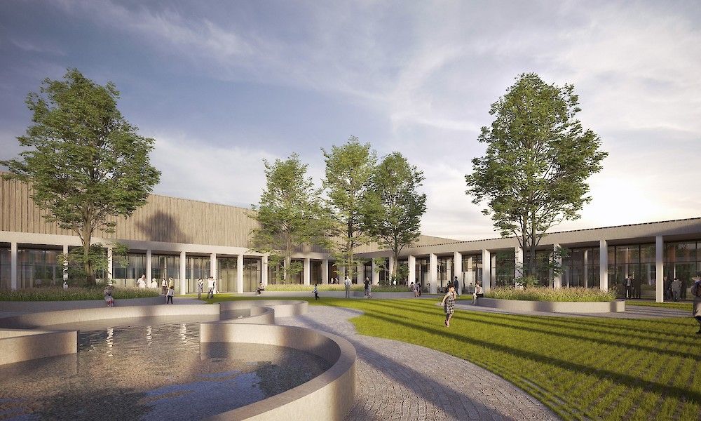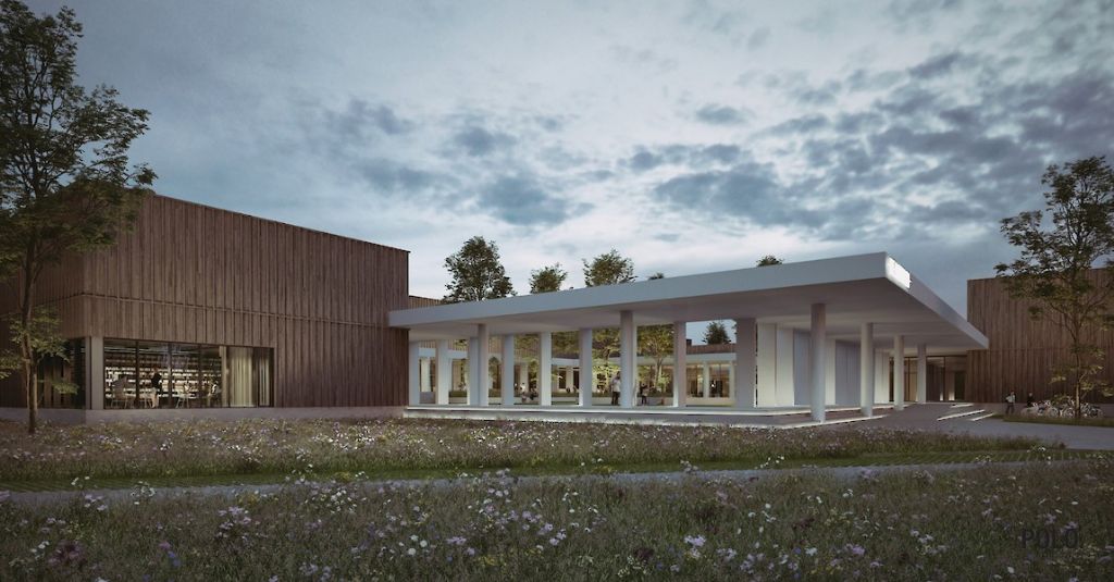 "Ruimtelijk en visueel vormt de zuilengang een gelede bufferzone tussen de verschillende, programma-elementen en het centrale tuin-plein. Het hart van het complex is een plaats van samenkomst: het vrijetijdsplein. Een collectieve ruimte staat zo centraal en een schaalbreuk met het dorp wordt voorkomen." – Mauro Poponcini, founding partner POLO Architects
