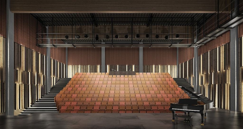De sporthal, het meest omvangrijke programma-element, wordt parallel aan de lange zijde van het terrein gepositioneerd. Dit volume is direct het meest zichtbare en beeldbepalende. Het vormt een sterk lineair element, dat ook als een geluidswal functioneert. Aan weerszijden van het sportvolume nestelen zich de kleinere volumes van theater en polyvalente zaal. Terwijl het complex een stoere en klare presentie heeft aan de N446 opent het complex zich naar de zijde van het dorp en de kerk; hier is de volumetrie meer gearticuleerd en opener opgevat. Het complex speelt zo strategisch in op de kwaliteiten en beperkingen van zijn locatie.
