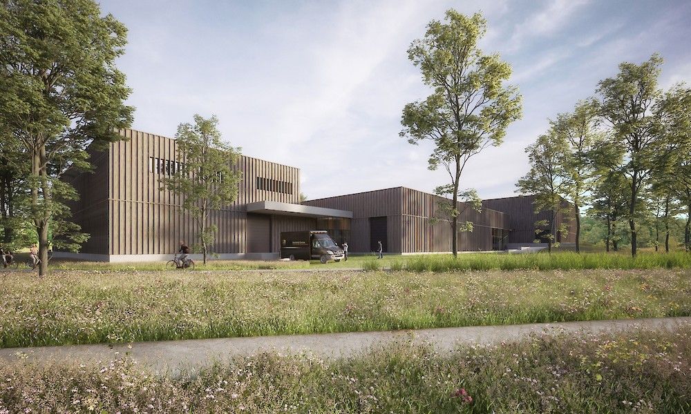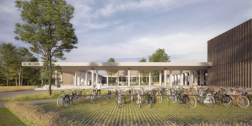 De vier hoofdvolumes zijn opgevat als relatief eenvoudige volumes met een sokkel in geprefabriceerd lichtgrijs architectonisch beton. Aan de bovenzijde van de gevelvlakken voorziet POLO Architects in een buitenafwerking met houten lattenwerk in verduurzaamd, gebrand hout, verwijzend naar het oertype van de landelijke schuur. Het ritme van de beplanking genereert een gevelbeeld met gelaagdheid en diepte. De neutrale, donkere ritmische gevel vormt een sprekende maar discrete achtergrond waartegen andere elementen tot hun recht komen: colonnade, bomen, begroening – en de mensen.