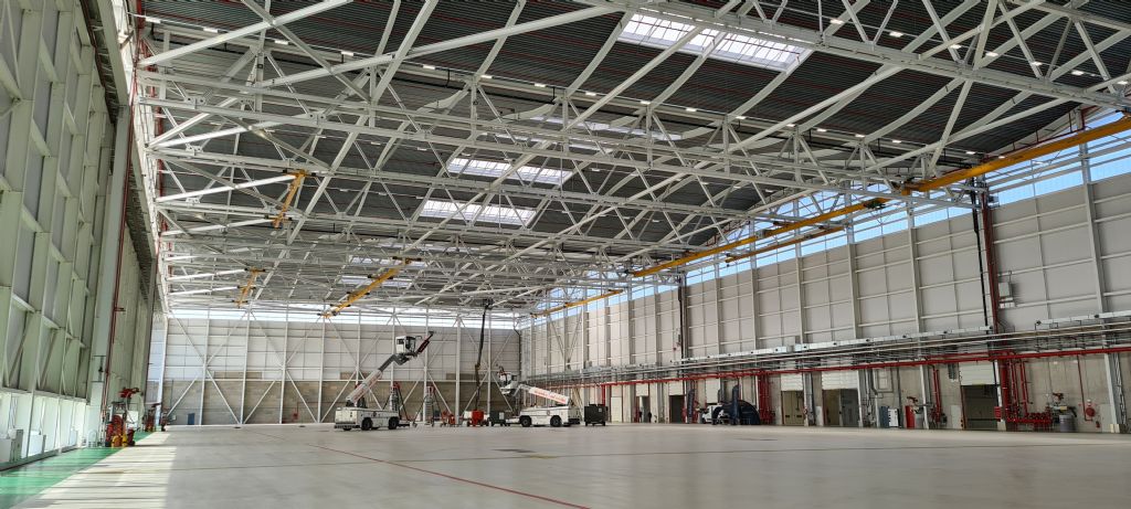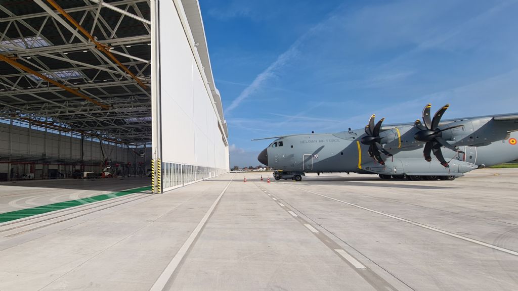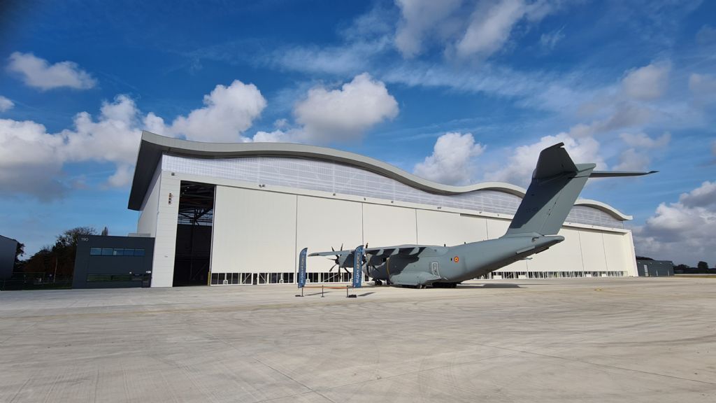 Poorten zo groot als een voetbalveld en een dak van bijna 14.000 vierkante meter. Na een bouwtraject van amper 20 maanden is de oplevering van de grootste vliegtuighangar die Defensie ooit heeft neergezet een feit. De megaloods is neergezet door bouwbedrijf Democo en doet vanaf nu dienst voor het onderhoud van de nieuwe transportvliegtuigen van België en Luxemburg, de Airbus A400M. In de multifunctionele hangar is ook ruimte voor twee verdiepingen aan kantoren en extra opslagplaatsen. Het ontwerp is van de hand van het Franse bureau Kardham in samenwerking met STYFHALS architecten, Tractebel Engineering en Ney & Partners.