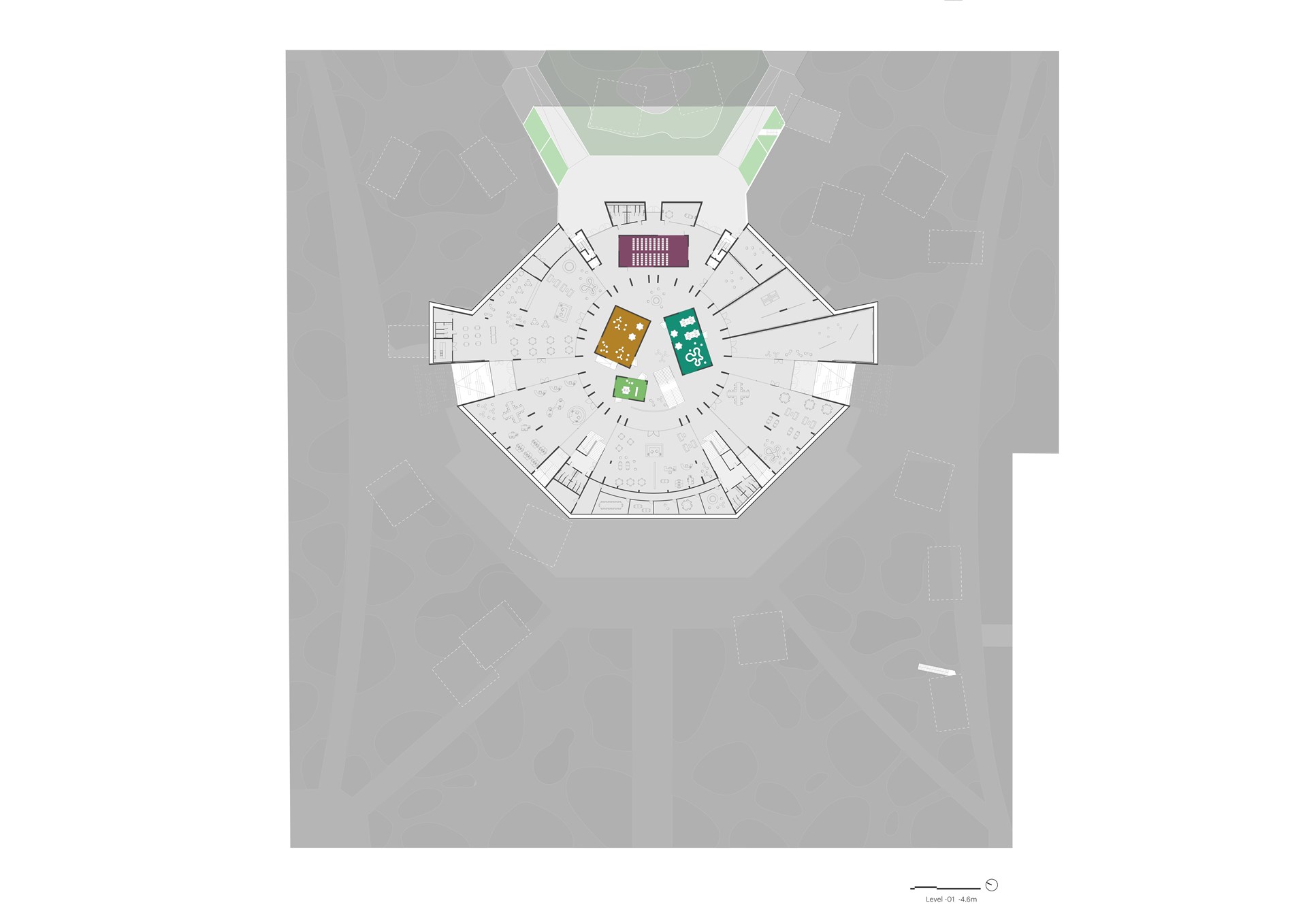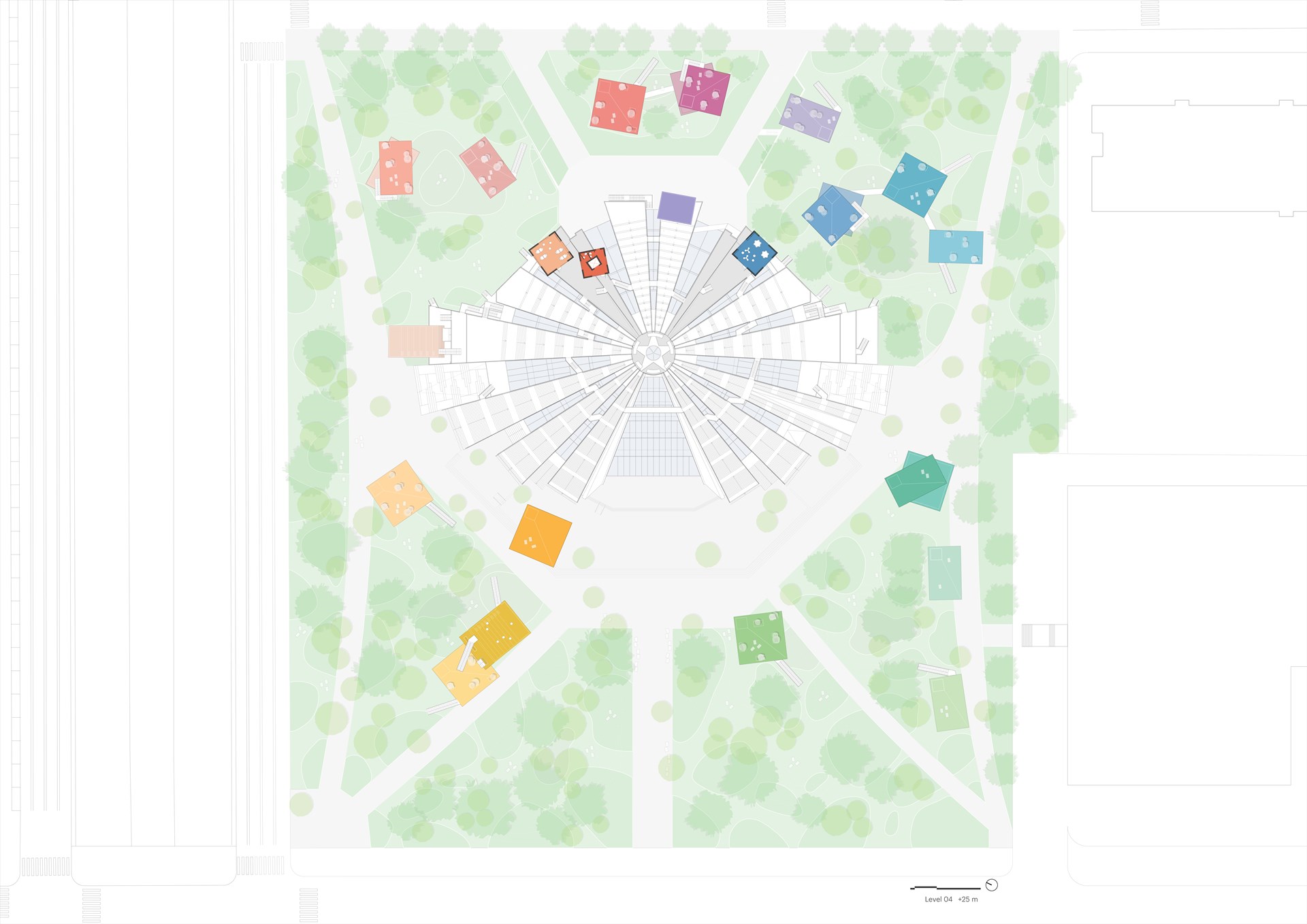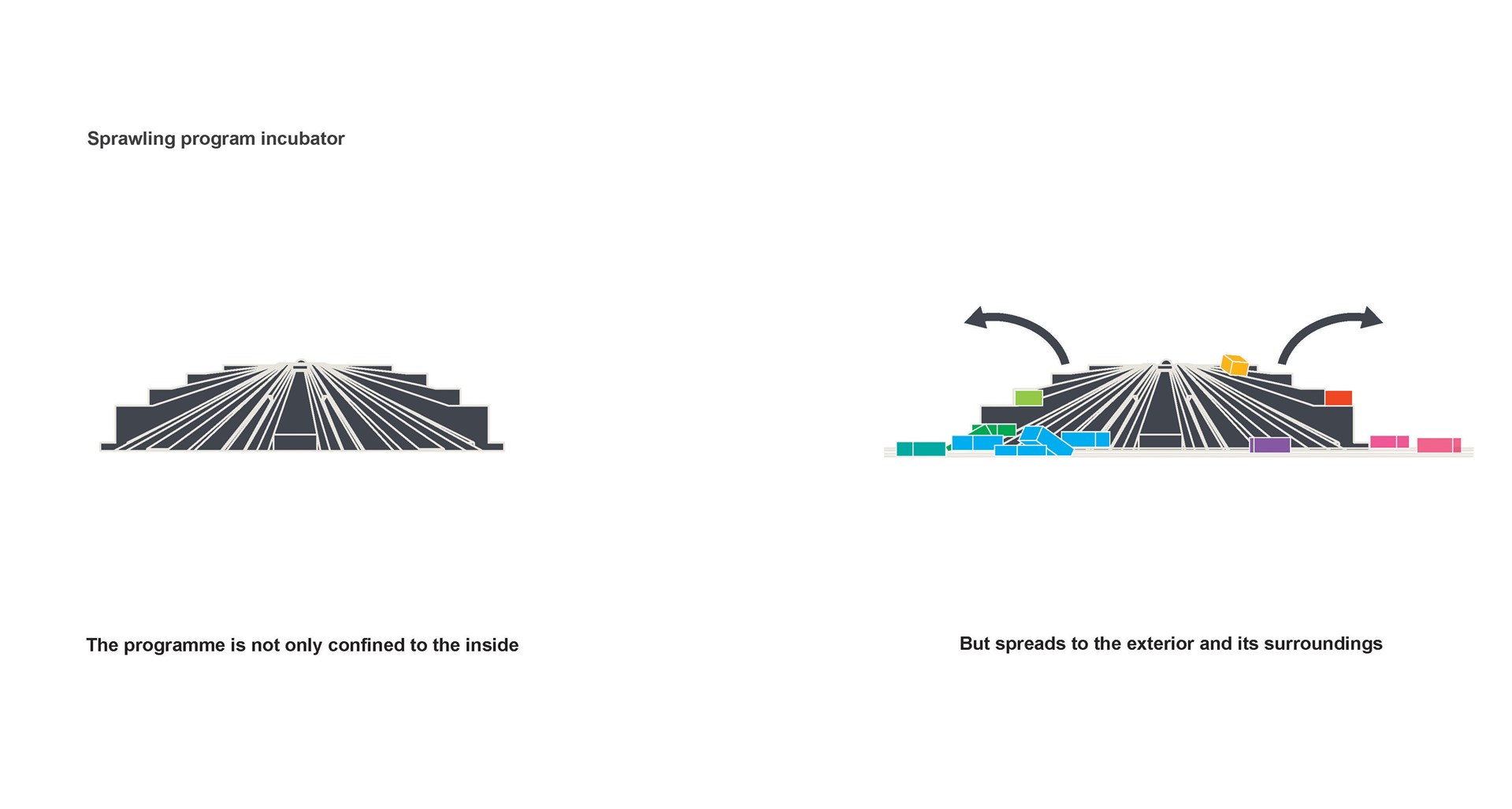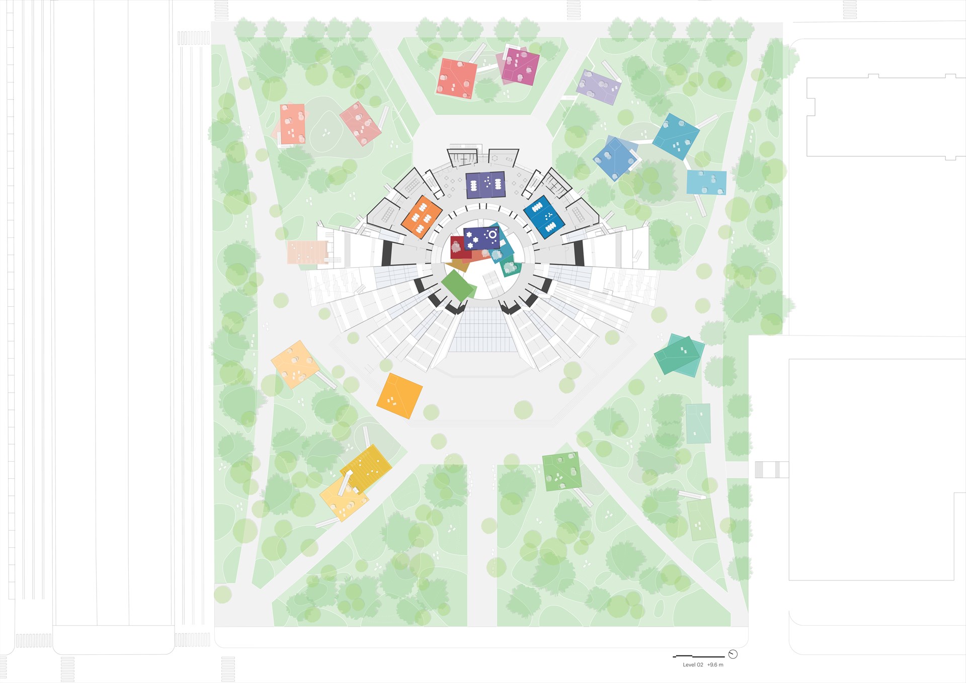 Voor het ontwerpteam vormde de bestaande structuur een blauwdruk waaraan publiek toegankelijke ruimtes voor educatie en evenementen zijn toegevoegd. De structuur is helemaal open als een sculptuur in het park. Ze kan via een glazen hek worden afgesloten. Bezoekers die het park en de sculptuur betreden, zien her en der gestapelde ‘dozen’ in verschillende kleuren en afmetingen te vinden, sommige gekanteld, andere recht, wat het park eromheen de atmosfeer van een festival geeft. Een soort gekraakte structuur.