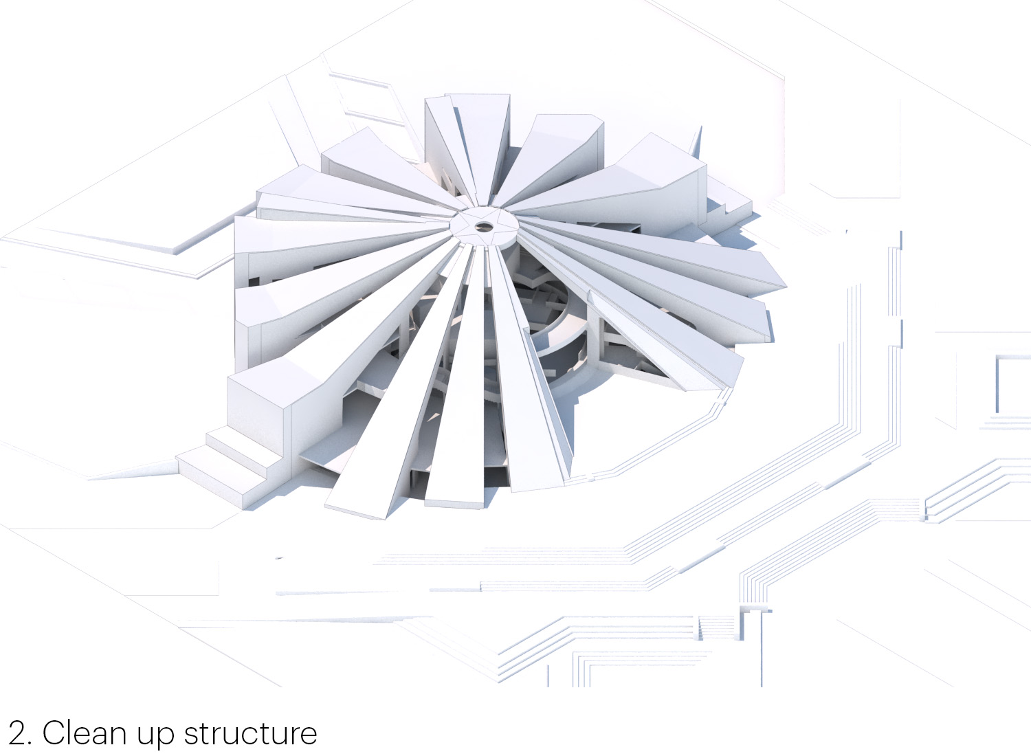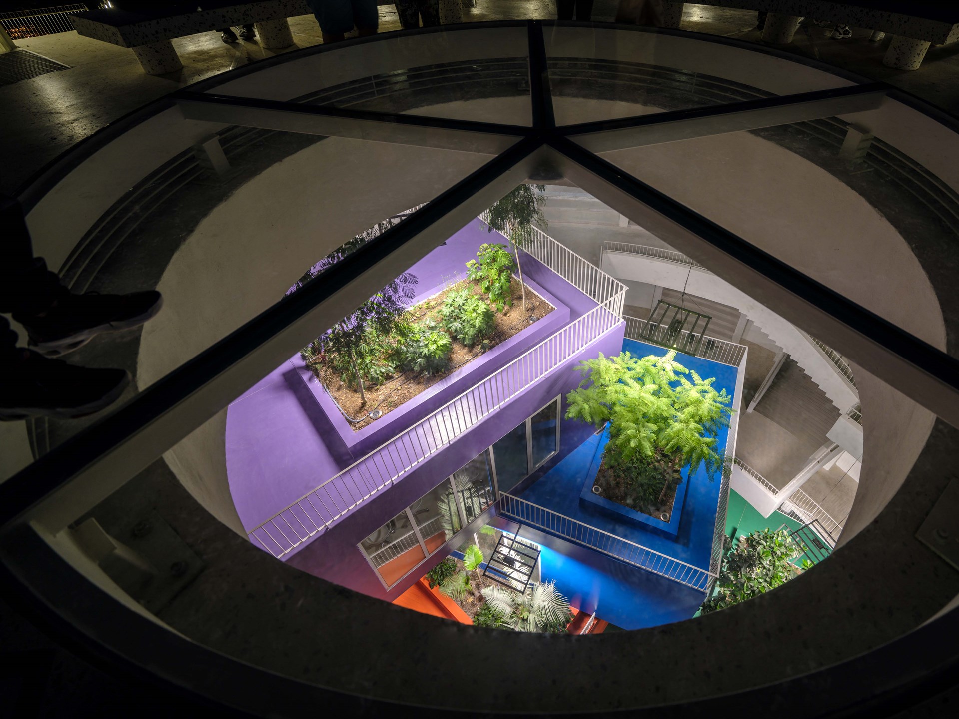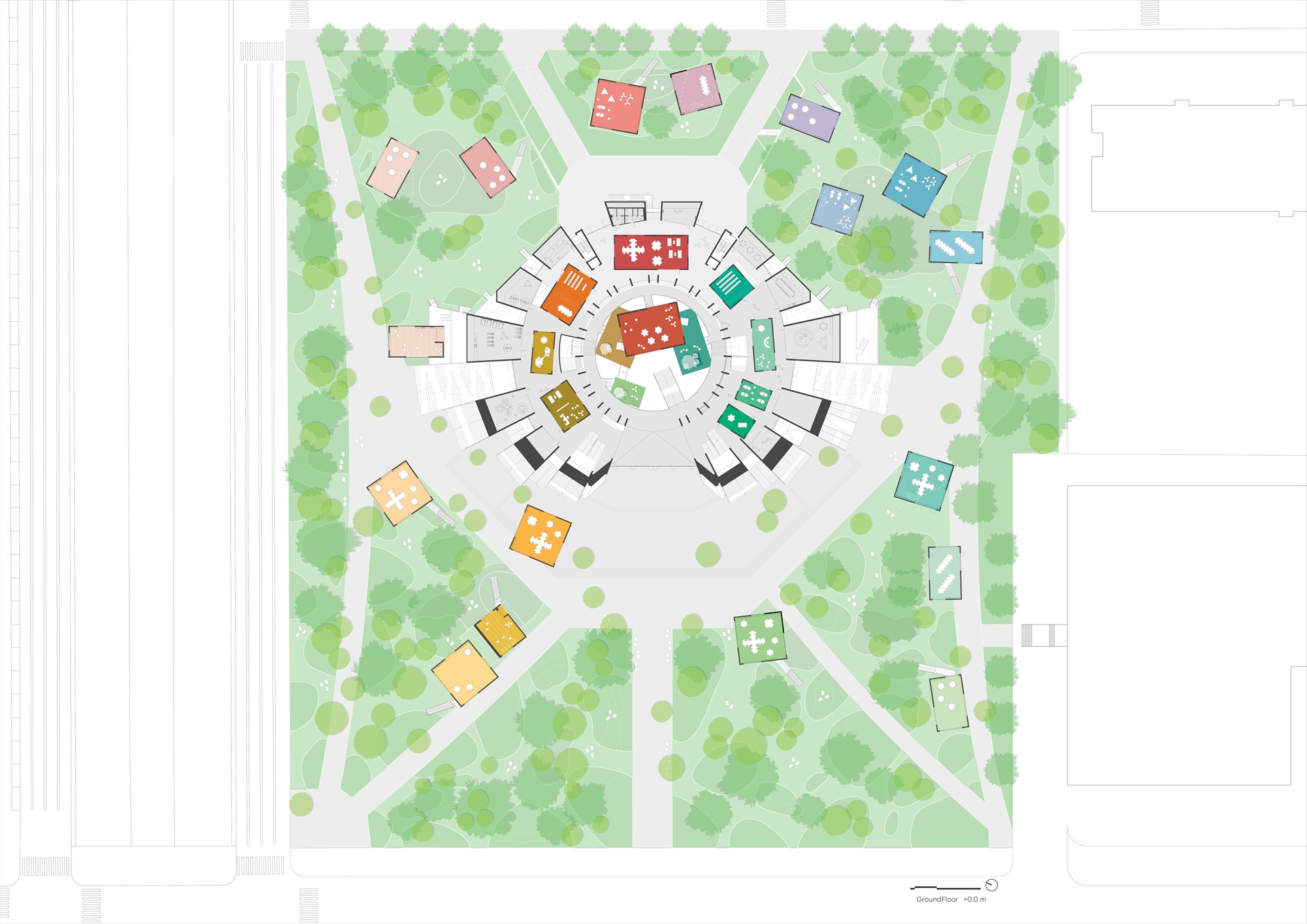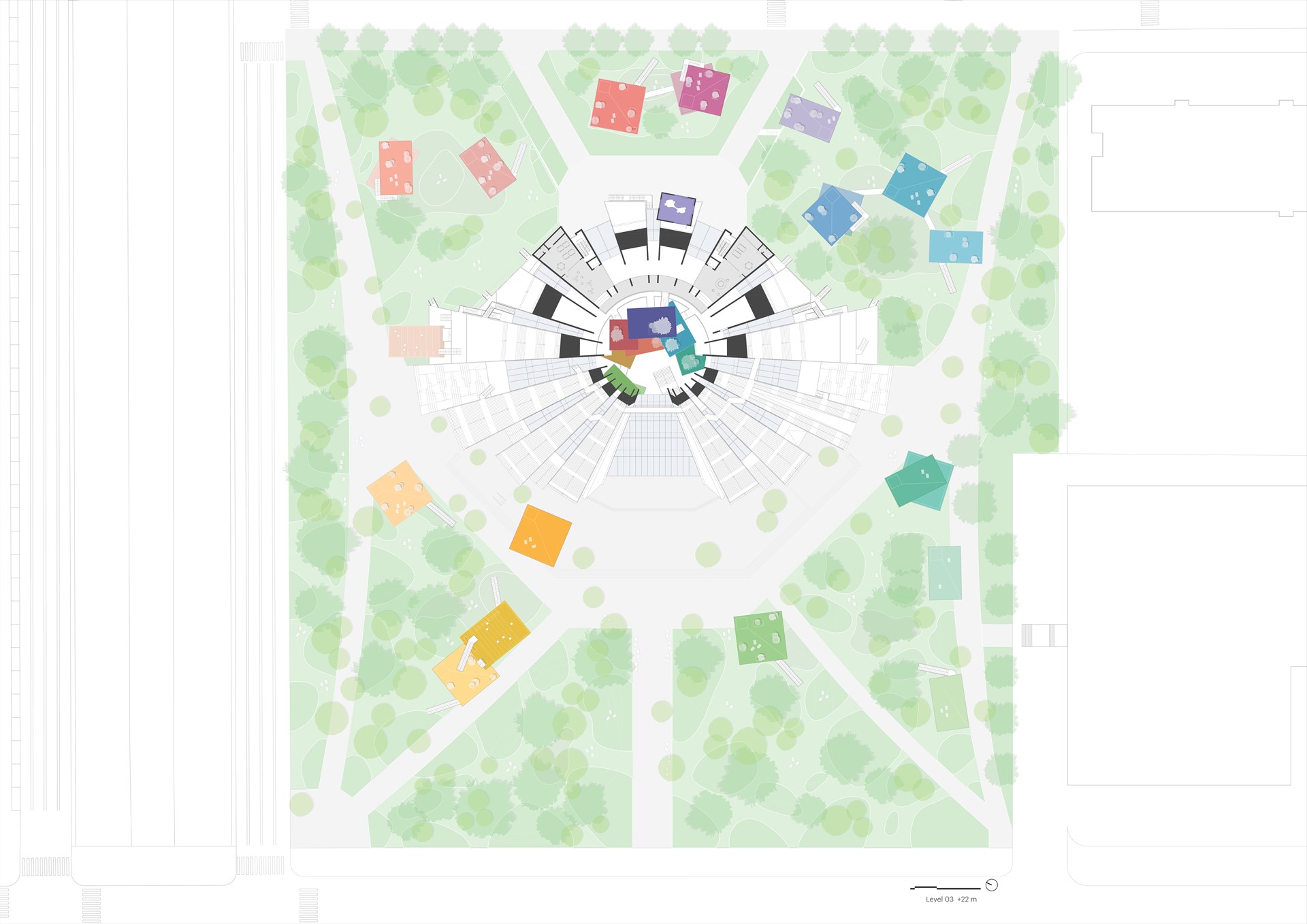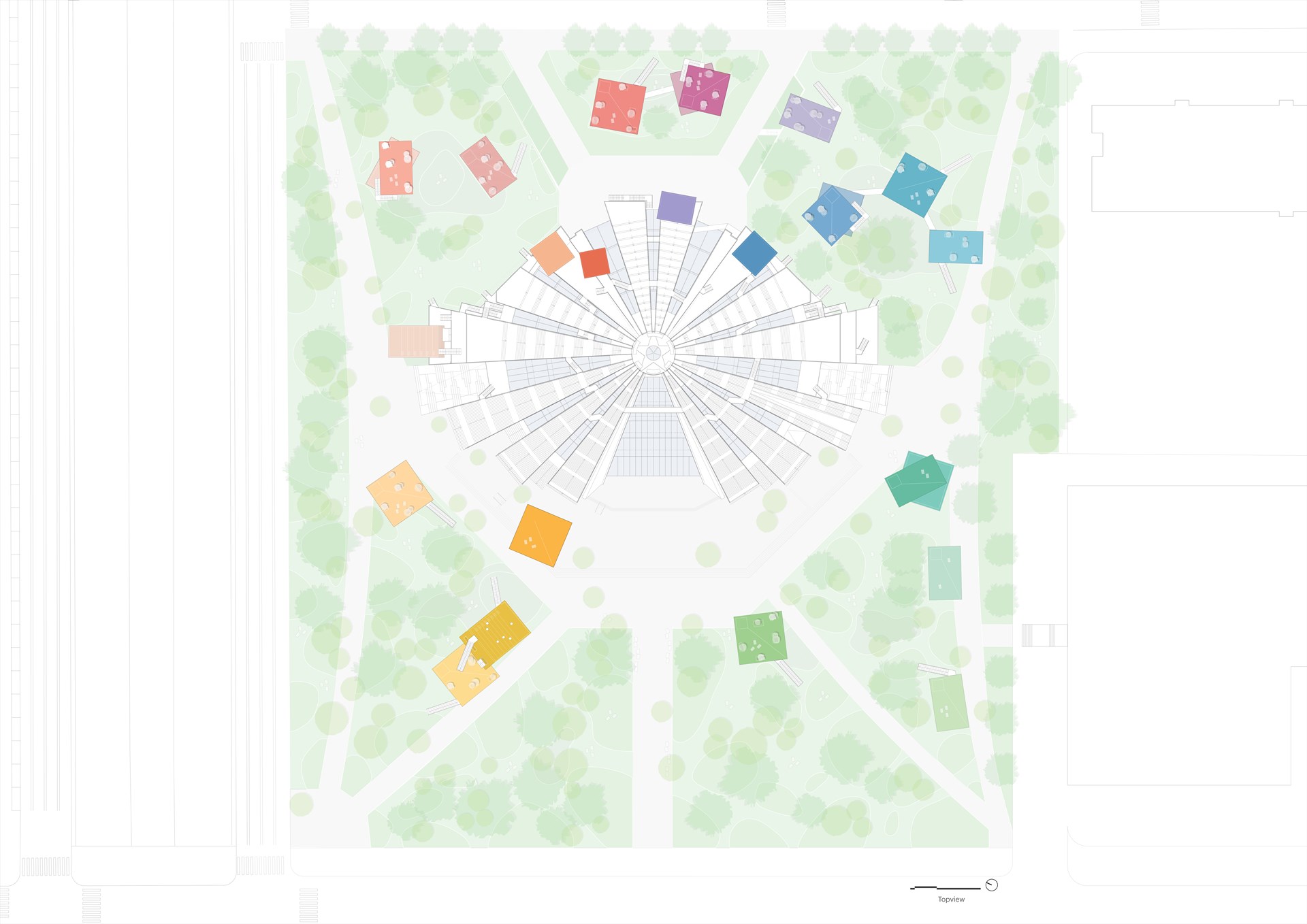 Voor het ontwerpteam vormde de bestaande structuur een blauwdruk waaraan publiek toegankelijke ruimtes voor educatie en evenementen zijn toegevoegd. De structuur is helemaal open als een sculptuur in het park. Ze kan via een glazen hek worden afgesloten. Bezoekers die het park en de sculptuur betreden, zien her en der gestapelde ‘dozen’ in verschillende kleuren en afmetingen te vinden, sommige gekanteld, andere recht, wat het park eromheen de atmosfeer van een festival geeft. Een soort gekraakte structuur.