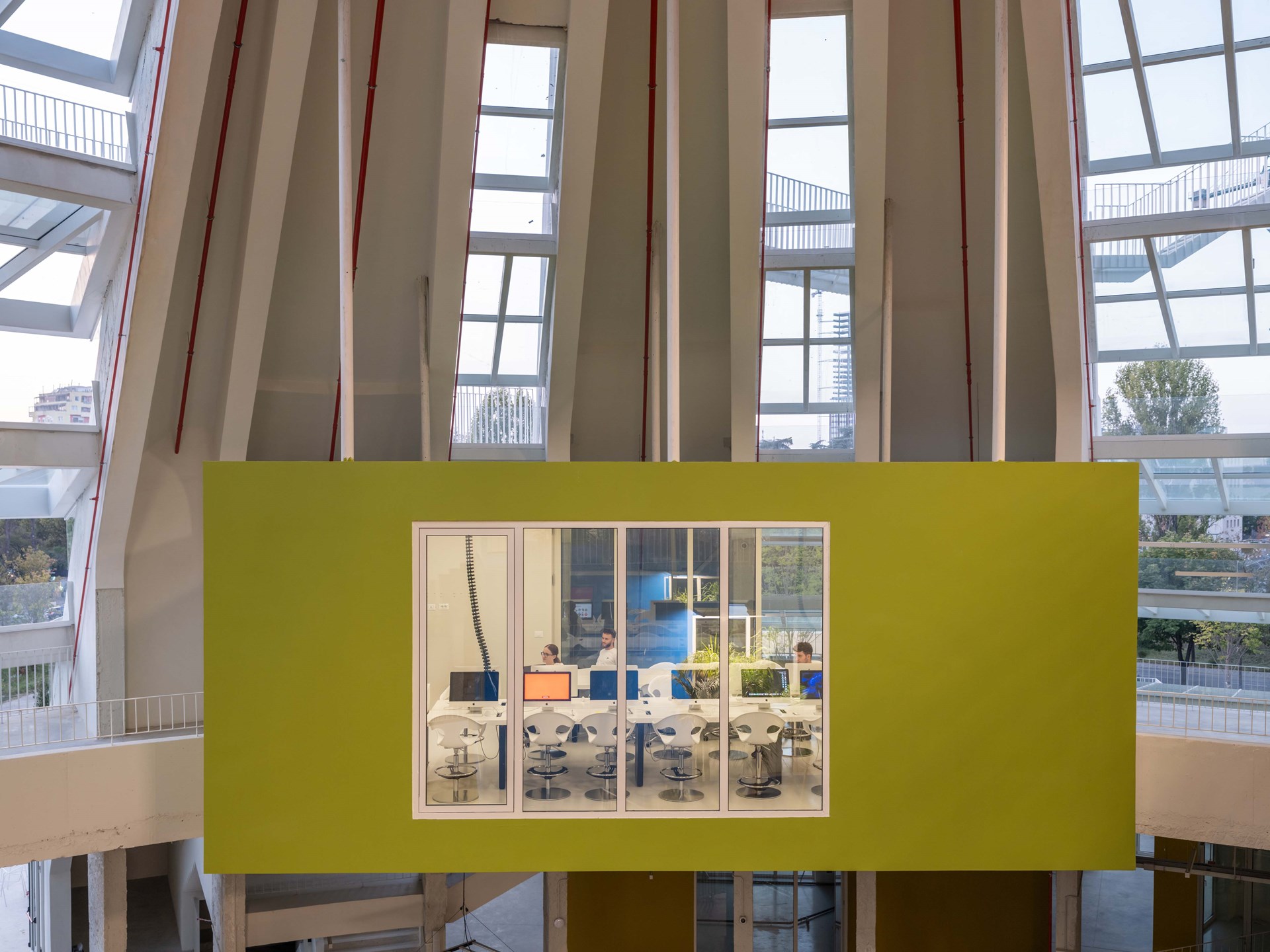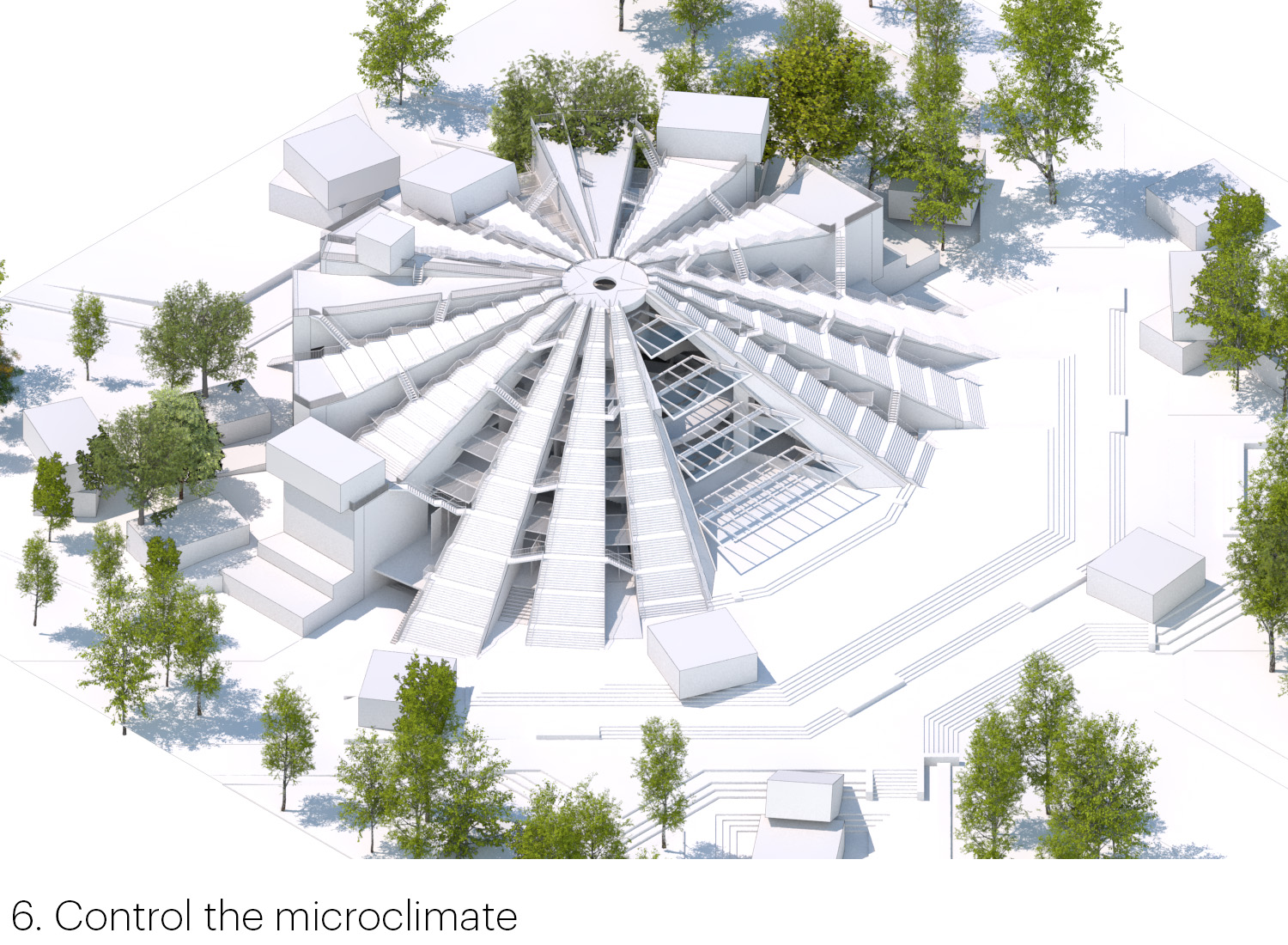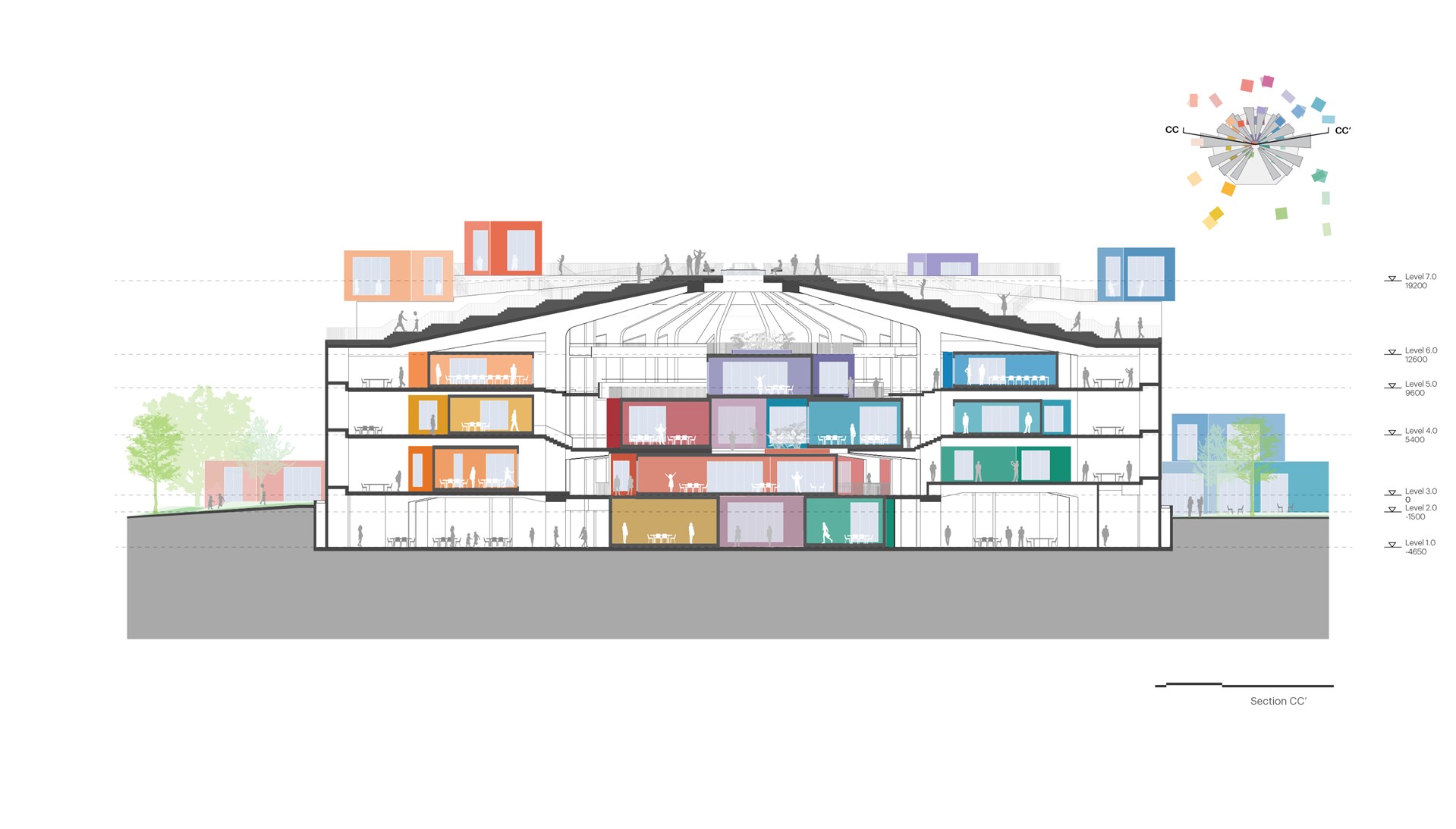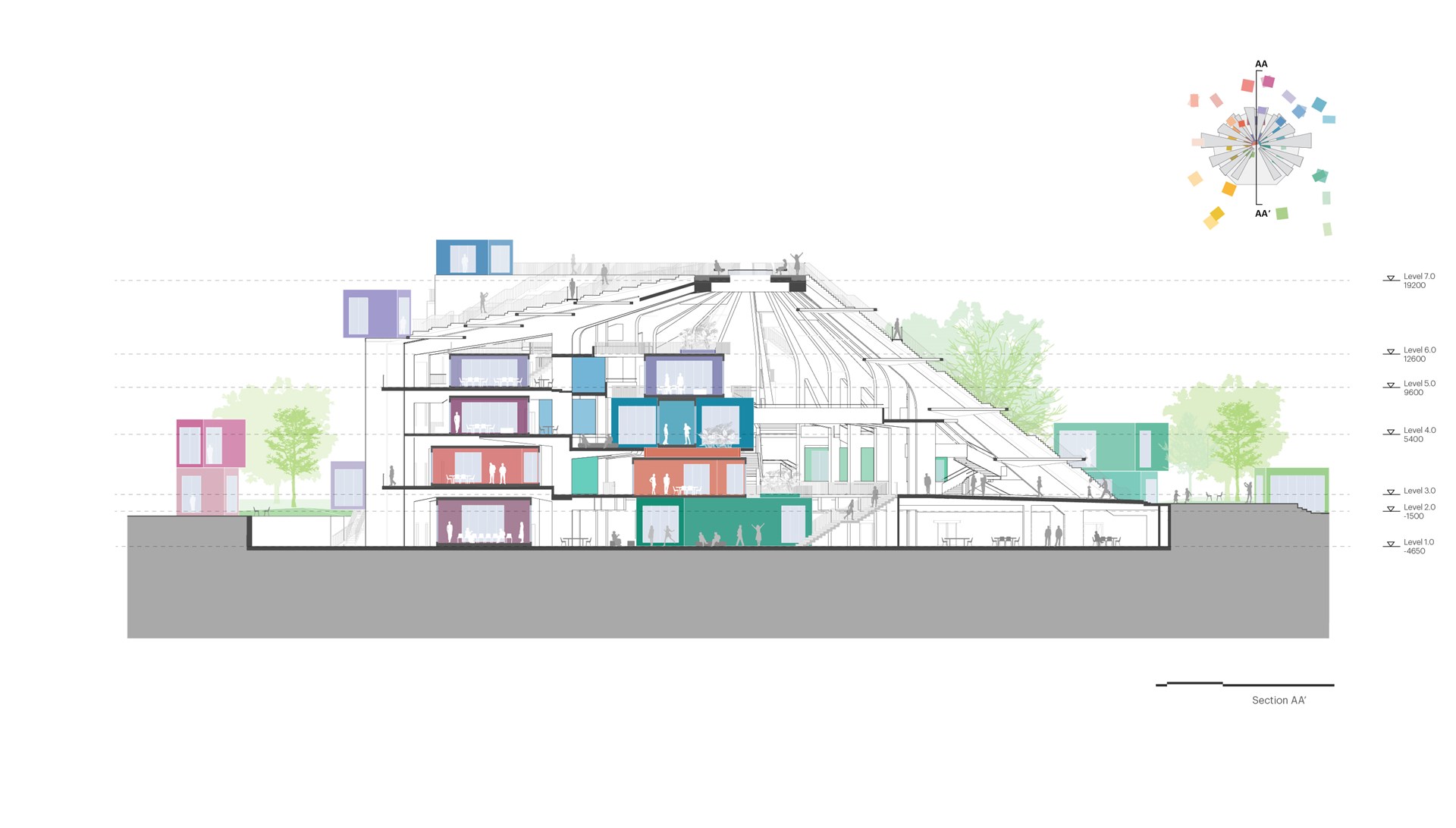 Voor het ontwerpteam vormde de bestaande structuur een blauwdruk waaraan publiek toegankelijke ruimtes voor educatie en evenementen zijn toegevoegd. De structuur is helemaal open als een sculptuur in het park. Ze kan via een glazen hek worden afgesloten. Bezoekers die het park en de sculptuur betreden, zien her en der gestapelde ‘dozen’ in verschillende kleuren en afmetingen te vinden, sommige gekanteld, andere recht, wat het park eromheen de atmosfeer van een festival geeft. Een soort gekraakte structuur.