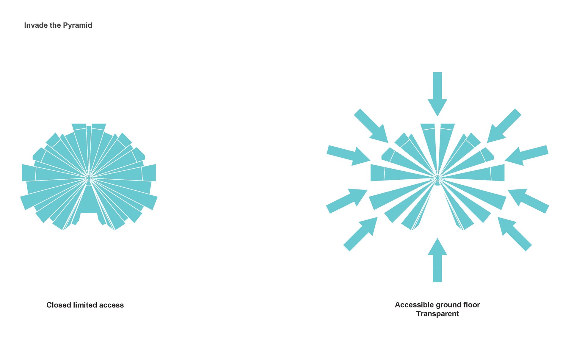 Voor veel Albanezen is de Pyramid een symbool van de overwinning op het communistische regime. De manier waarop jongeren het gebouw gebruikten, inspireerde het ontwerp van MVRDV: het vervallen bouwwerk diende namelijk lange tijd als hangplek voor jongeren uit Tirana. Zij beklommen de schuine balken en gleden er vervolgens – niet zonder risico – weer vanaf. Na de renovatie zijn er nu treden gemaakt aan bijna alle schuine zijden, zodat iedereen naar de top kan. Voor mensen die moeilijk ter been zijn, is er een lift gemaakt aan de westkant van de Pyramid. Eén balk heeft nog een schuin deel waar mensen vanaf kunnen glijden.