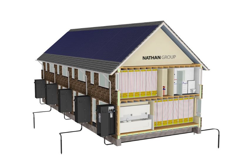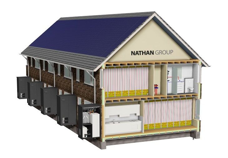 De Energiemodule van de Nathan group is een compacte aanbouw waarin alle installatiecomponenten voor duurzame verwarming en de bereiding van warm tapwater zijn samengebracht tot één product. De prefab energiemodule wordt ‘plug-and-play’ gebouwd, tegen de voor- of achtergevel of in het dak van een woning geplaatst en aangesloten op het afgiftesysteem van de woning. Bij de dakvariant wordt de complete unit op de bovenverdieping geplaatst, waarbij het bovenste gedeelte zich op het dak bevindt.