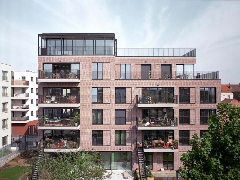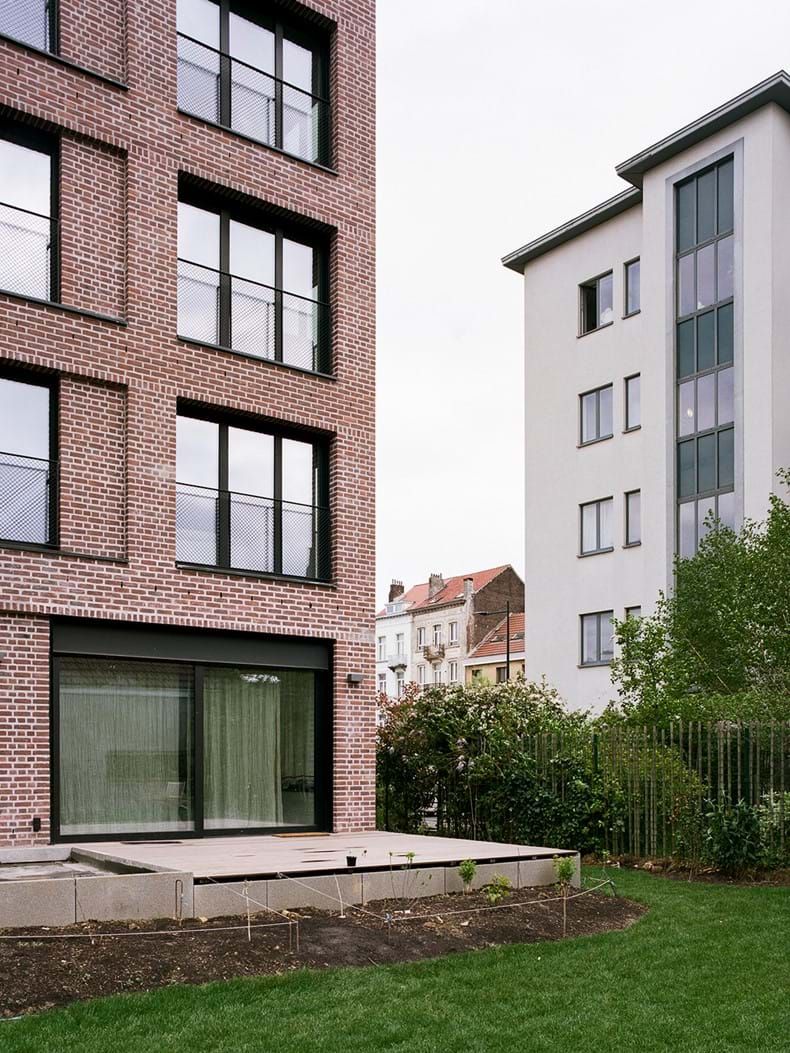 "We hebben de stenen ook in de raamkaders verwerkt en creëren hiermee extra diepte door ze ca. 10 cm terugliggend te metselen. Door te opteren voor een traditionele voeg in plaats van een dunne voeg konden we ook werken met een modulair staand verband voor deze gevelfragmenten. Ze zijn een verwijzing naar het verleden toen Brusselse ramen werden dichtgemetseld omdat er een daglichtbelasting van kracht was. Het is ook een manier om de kolomstructuur in de gevel te markeren en elk gemetseld raam impliceert de potentiële aanwezigheid van een echt venster (in de toekomst)."