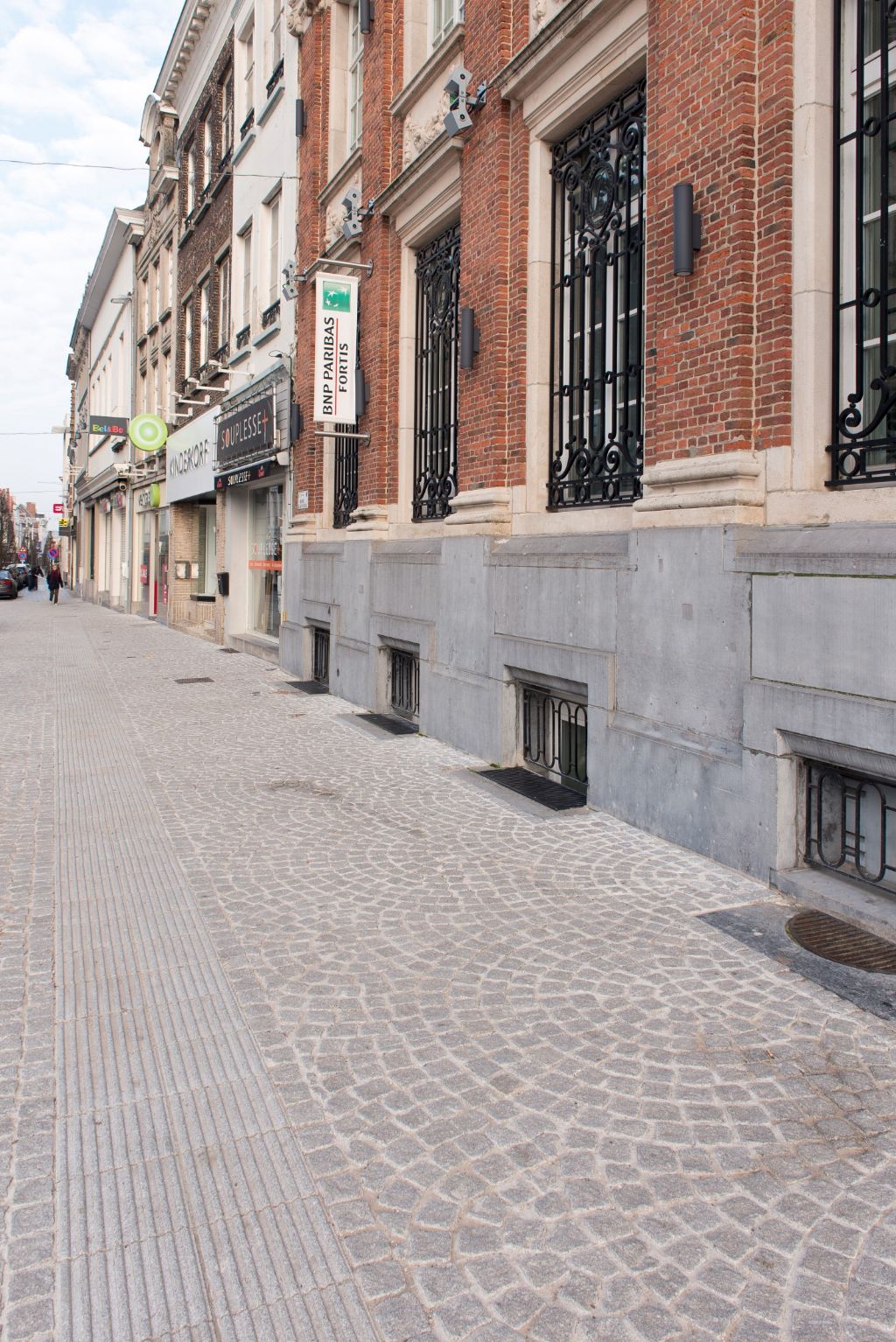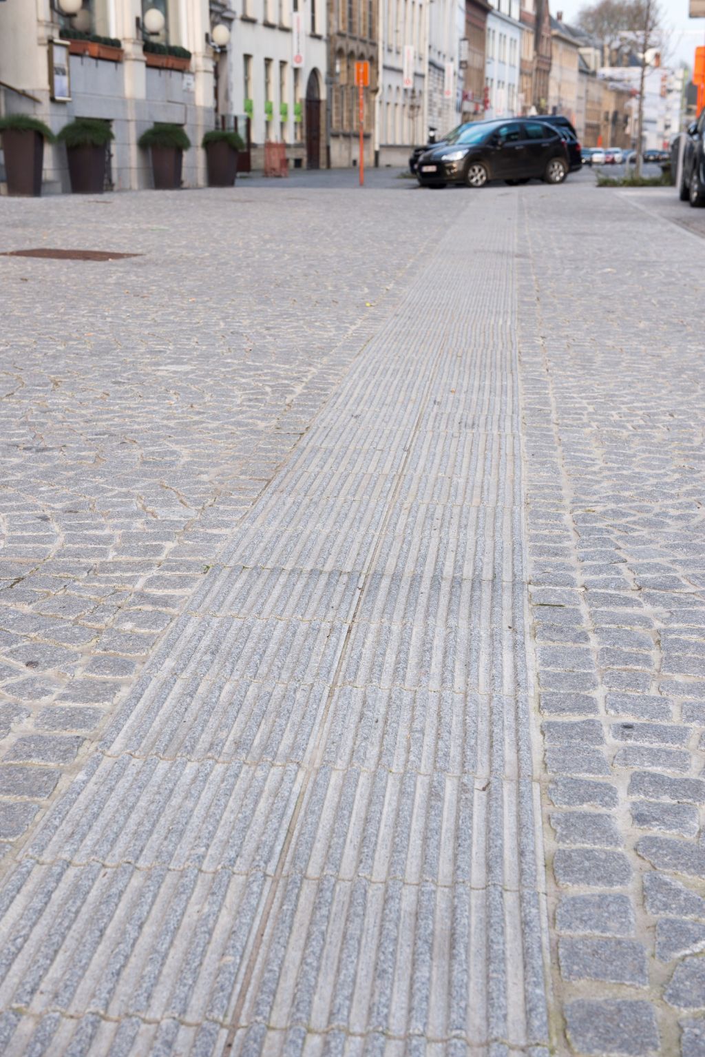 Met de keuze van de Portugese Granja Mozaiëken (8/10 en 9/11 cm – totaal: +/- 10.000m²) en Kasseien (14x20x14) kiest Oudenaarde bewust voor duurzame natuursteen van Europese origine. De boordstenen, geleidetegels en noppentegels komen in de Lichtgrijze Chinese graniet Shangdong Grey.