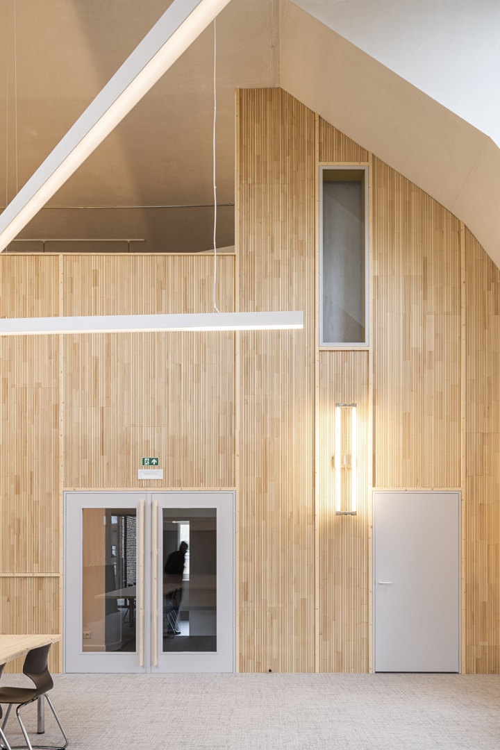 Dat resulteerde in de realisatie van een droogbouwinvulling die de erfgoedwaarde van de ruimte maximaal respecteert. De droogbouwinvulling is niet alleen circulair omdat ze omkeerbaar is dankzij in het zicht gelaten mechanische verbindingen, maar ook omdat ze uit hout bestaat, een hernieuwbaar materiaal.