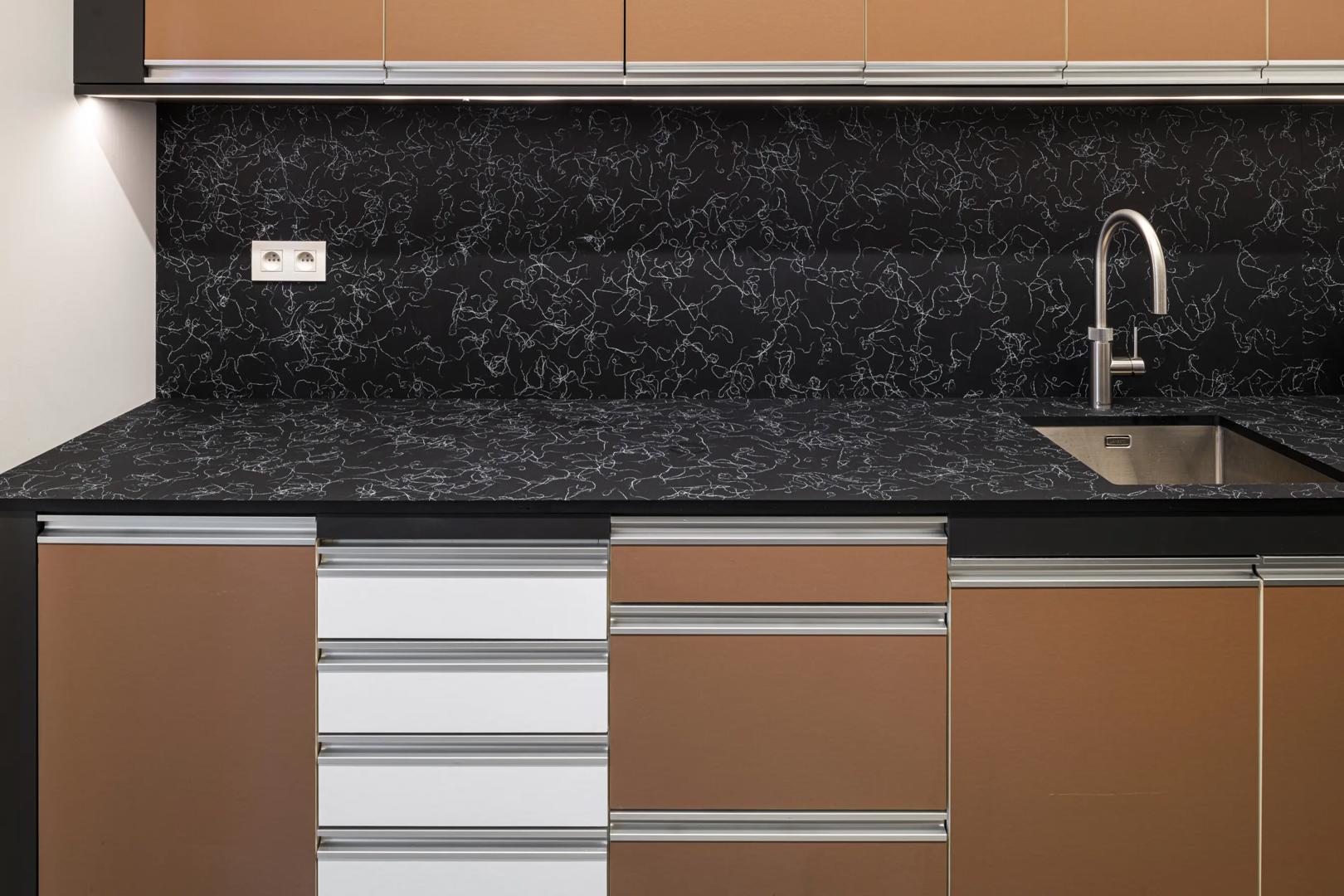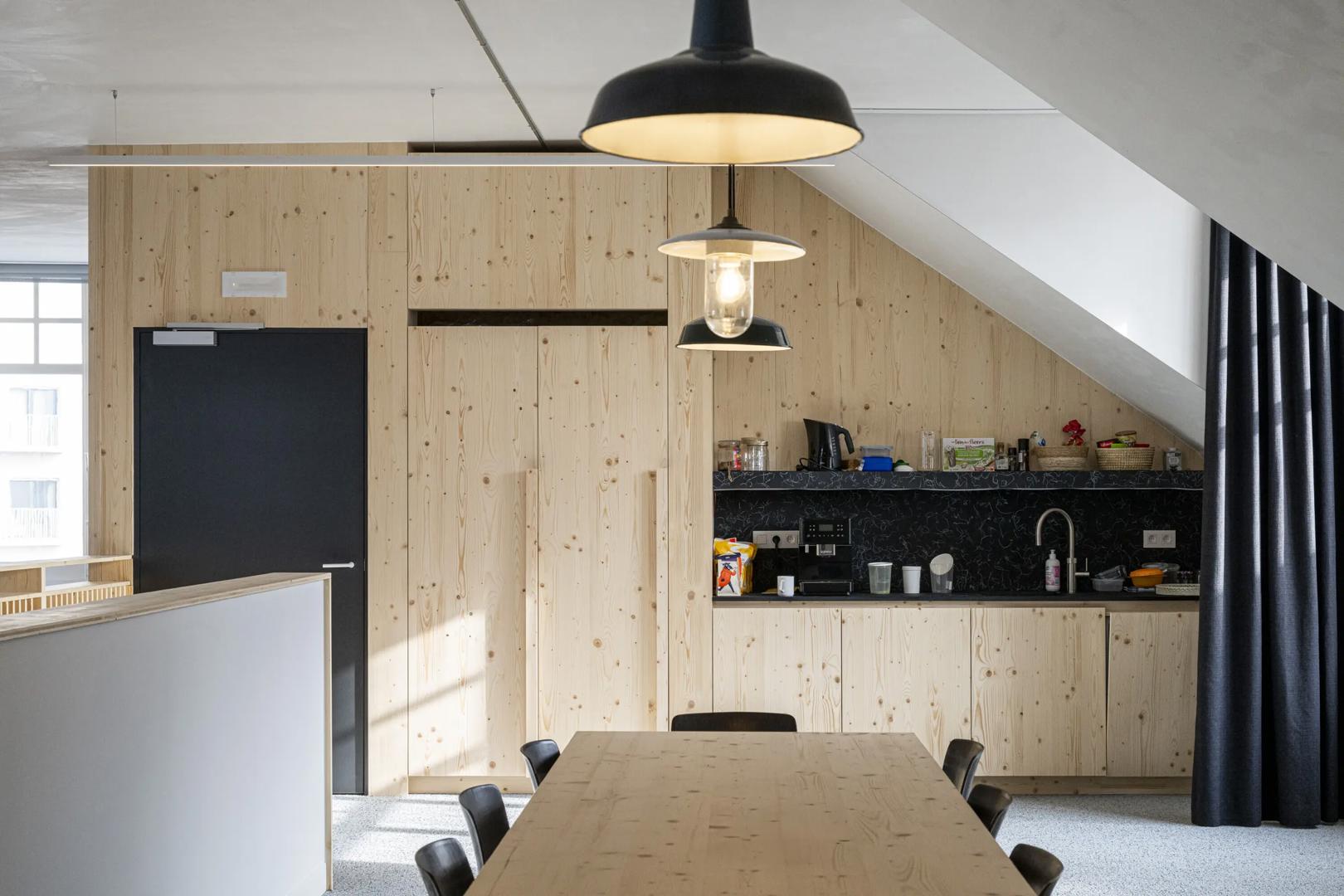 Zoals dat wel vaker gaat in circulaire projecten, werd het nieuwe kantoor van NAV gerealiseerd in bouwteam: DENC-STUDIO werkte nauw samen met Woema, dat de uitvoering voor zijn rekening nam. De bouwteamformule zorgde ervoor dat de circulariteit van het project kon worden uitgepuurd. Op aangeven van Woema, werden niveauverschillen in de bestaande ondervloer bijvoorbeeld overbrugd met een computervloer afkomstig uit een kantoorgebouw in Brussel. En Woema zocht ook creatief mee naar een oplossing wanneer een lot recuperatiematerialen op de werf toch nog de nodige aanpassing vroeg om te kunnen worden toegepast in het project. De corpussen van de gerecupereerde keuken moesten bijvoorbeeld vergroot worden omdat ze onvoldoende diep waren voor de nieuwe gootsteen en kraan.