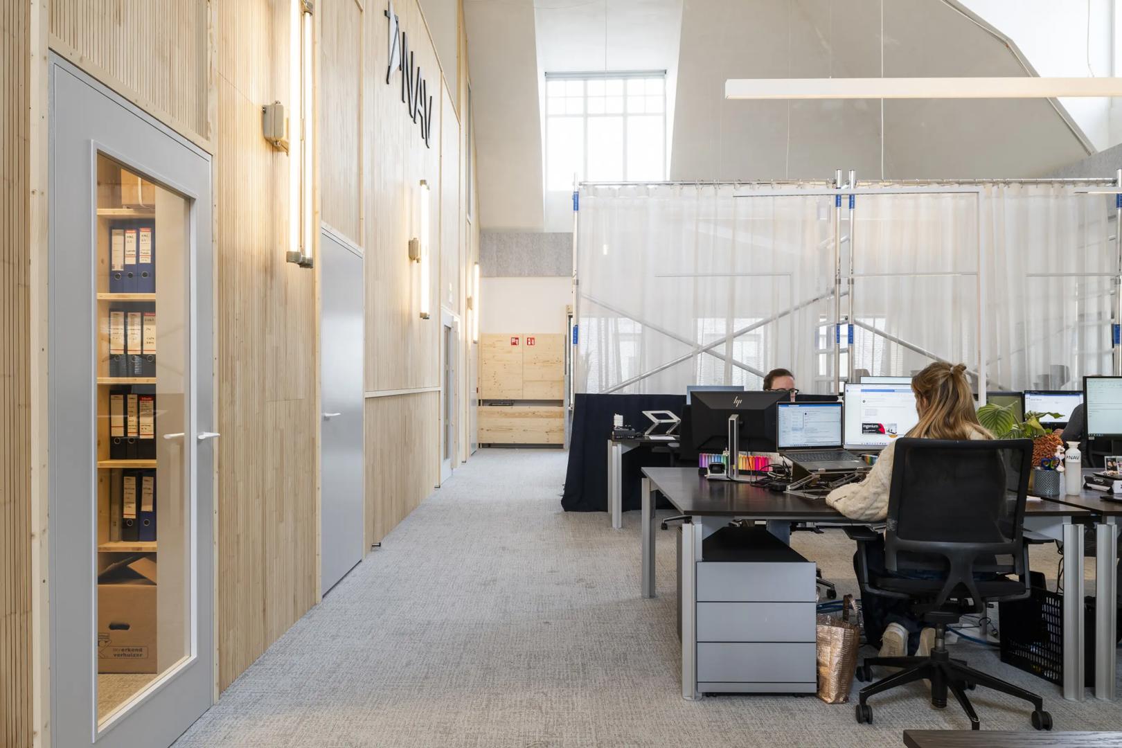 Een van de kantoorruimtes wordt sinds januari van dit jaar betrokken door NAV, dat zo afscheid nam van zijn hoofdkantoor in de Sint-Clarastraat in Brugge. De sectororganisatie voor Vlaamse architecten vertrouwde de inrichting van zijn nieuwe onderkomen na een ontwerpwedstrijd toe aan DENC-STUDIO, dat daarbij volop de kaart van circulair bouwen trok. Het ontwerpbureau was daarmee niet aan zijn proefstuk toe. Enkele jaren geleden realiseerde het zijn eigen nieuwe kantoor in Loods 23, een voormalige overslagzone voor katoen in de Gentse Voorhaven, ook al op circulaire wijze.