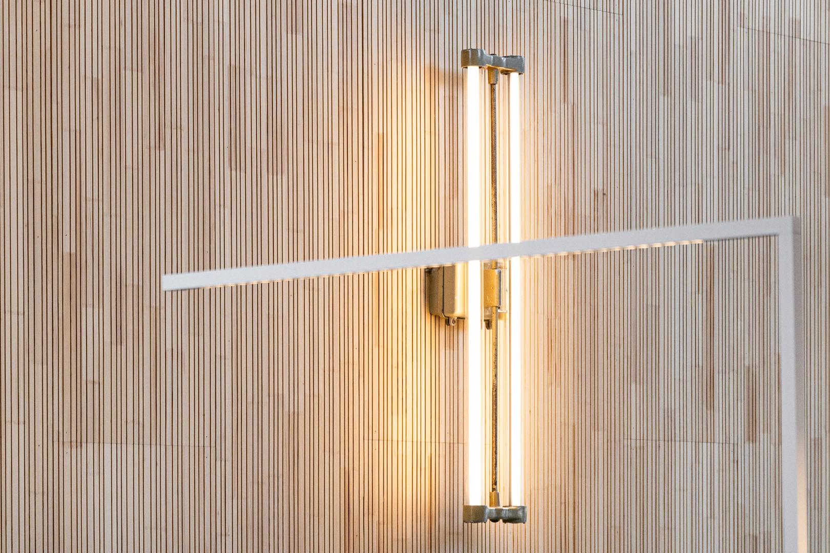 De nieuwe materialen die DENC-STUDIO toepaste, zijn gemaakt van reststromen, zoals de gordijnstoffen die geselecteerd werden uit de snijresten van bmfabrics – dat naar aanleiding van het project besloot het zogenaamde catch-of-the-dayconcept te lanceren, of hebben een lage ecologische impact, zoals het hout voor de droogbouwinvulling of de fermacell-platen waarmee de ontdubbelde vloer op de mezzanine werd opgebouwd.