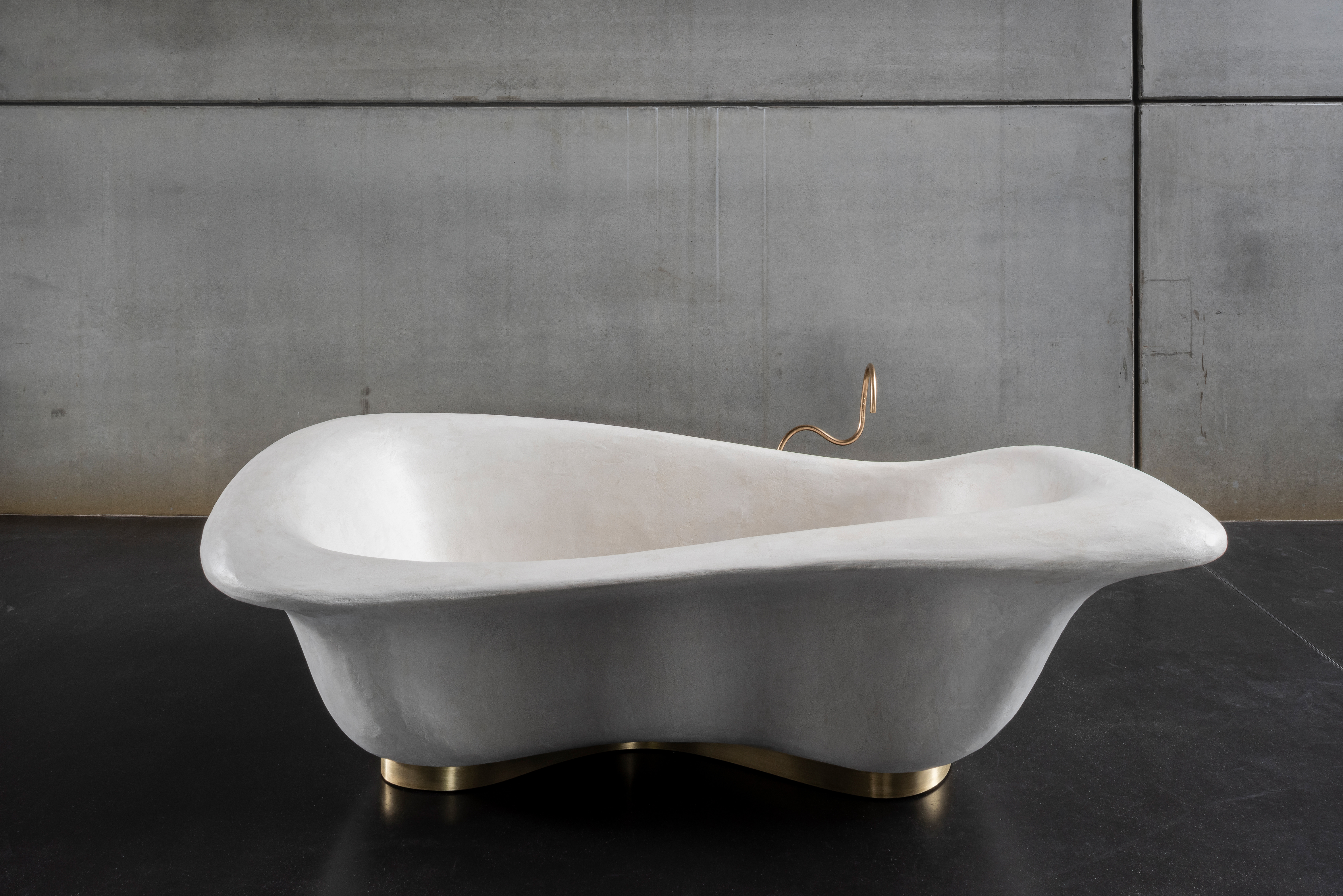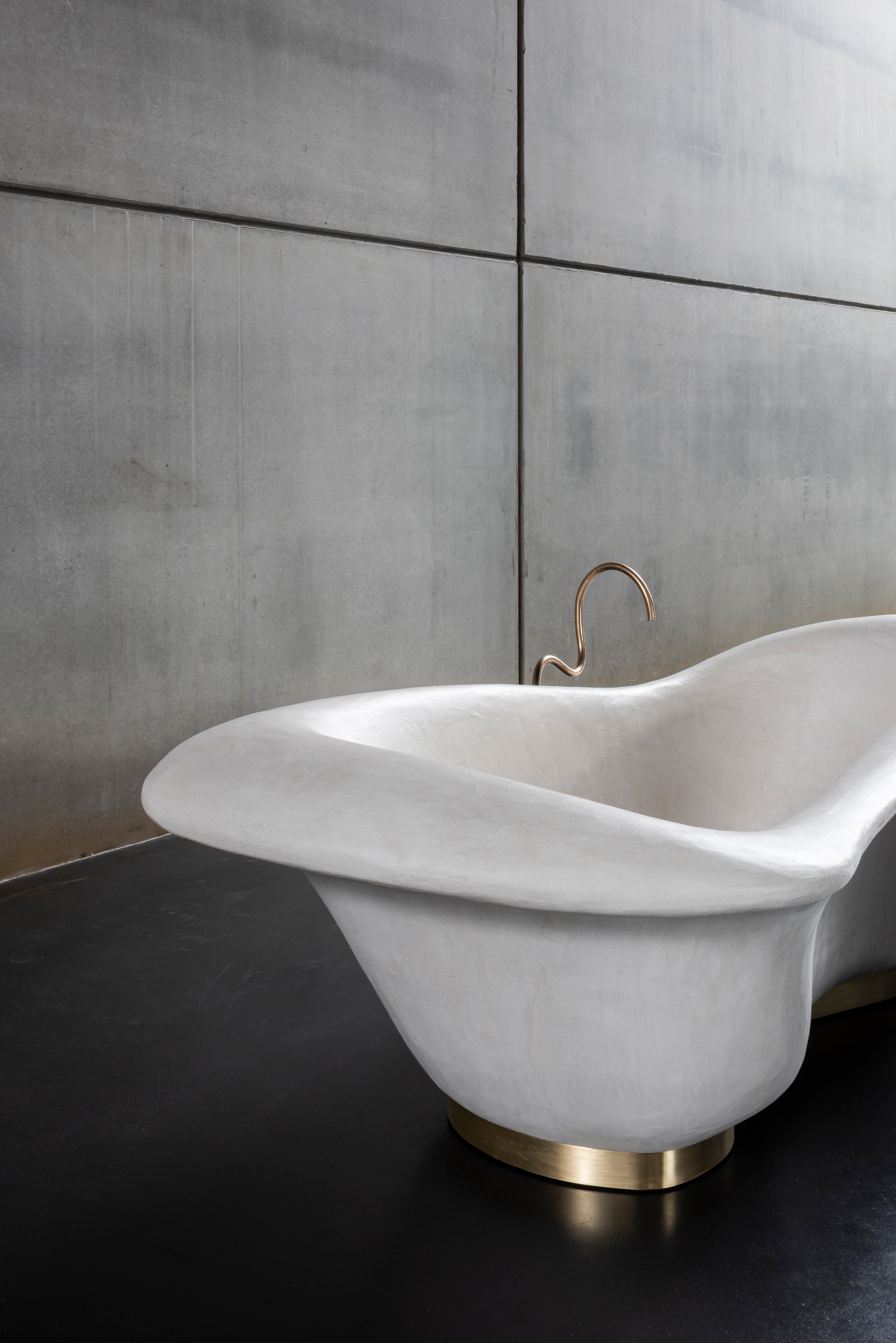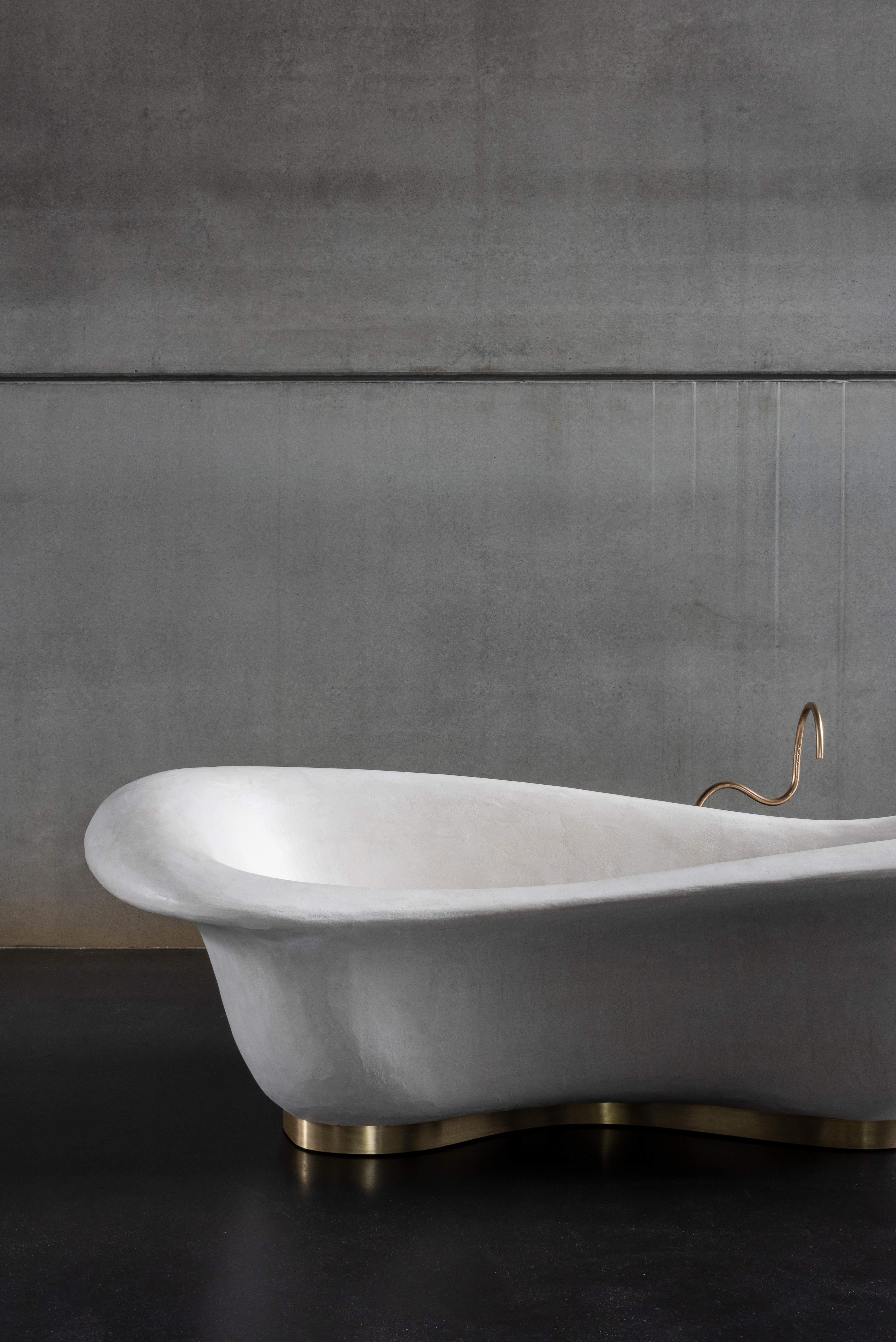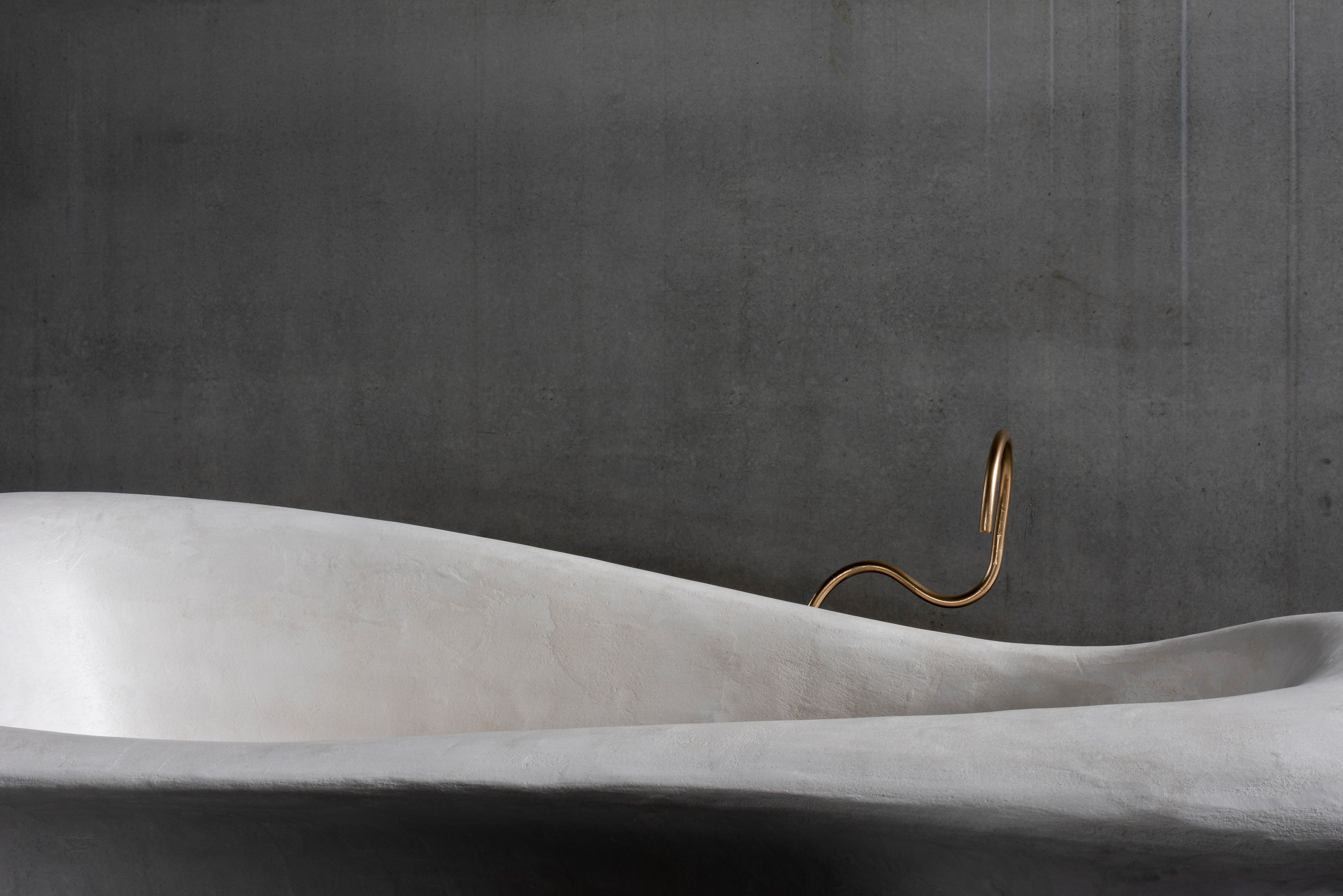 Dankzij het golvende design van de badkuip ligt de associatie met golvend water voor de hand. De textuur doet dan weer denken aan elementen uit de natuur. “Ik vertrok van een in ons atelier ontwikkeld materiaal, samengesteld uit mineralen en stoffen die in de natuur voorkomen en me toelieten om de sculptuur op te bouwen tot een badkuip die zowel mooi als ergonomisch is”, zegt Vervaeke. “De ambachtelijke werkwijze impliceert een grote creatieve vrijheid.”