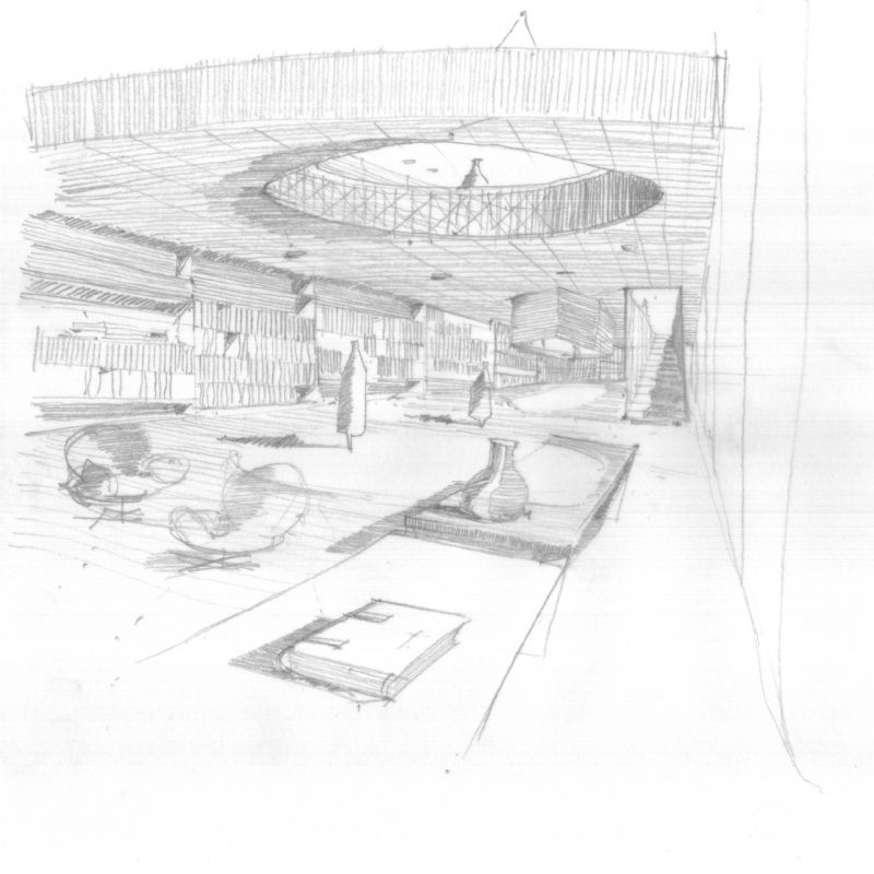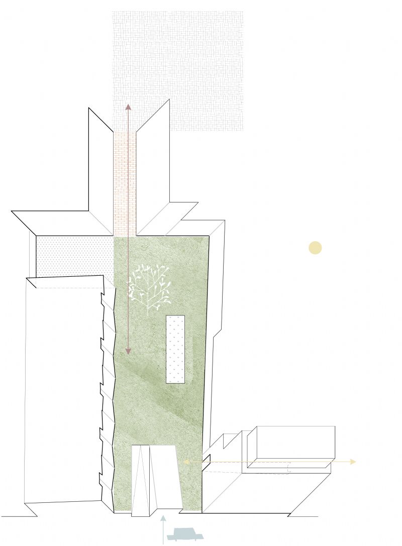 De steeg splitste het dienstencentrum van de bib & muziekschool. Deze splitsing toonde de gebouwen tegelijk heel duidelijk ten opzichte van elkaar: zorg tegenover muze. Kernwoorden waren reflectie, glimp, passant, synergie.
