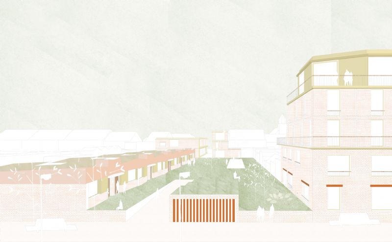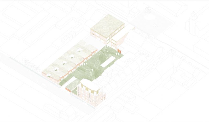 We installeerden twee duidelijke leegtes: een steeg en een grote tuin of dries, net zoals aan de overkant van de straat. Vier expliciete figuren schikten zich rond deze twee plekken. We maakten dus niet één, maar twee publieke gebouwen en twee woongebouwen. Leesbaar as such, als een familie van gebouwen, die hun programma's resoneren. Drie van de gebouwen vervolledigden het straatprofiel. De platte koek van woningen schurkte als vierde figuur tegen de tuinmuur aan.