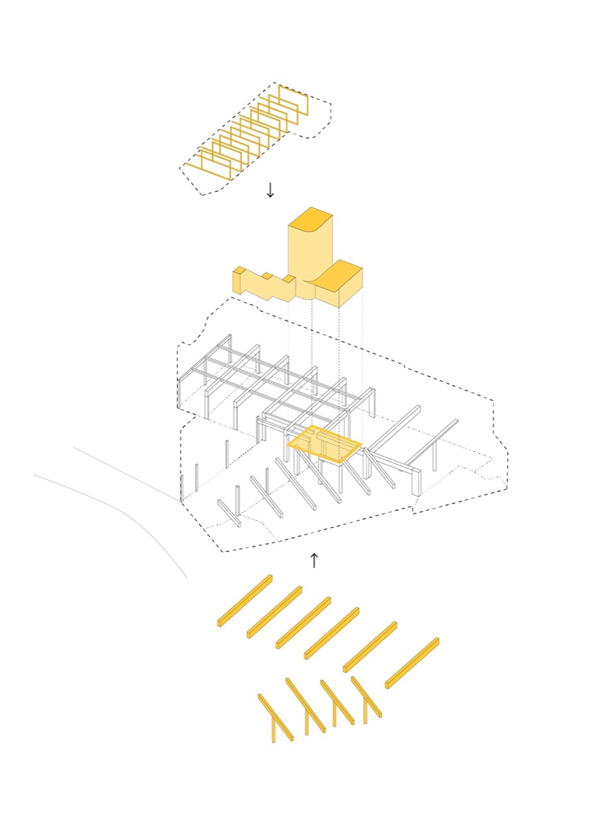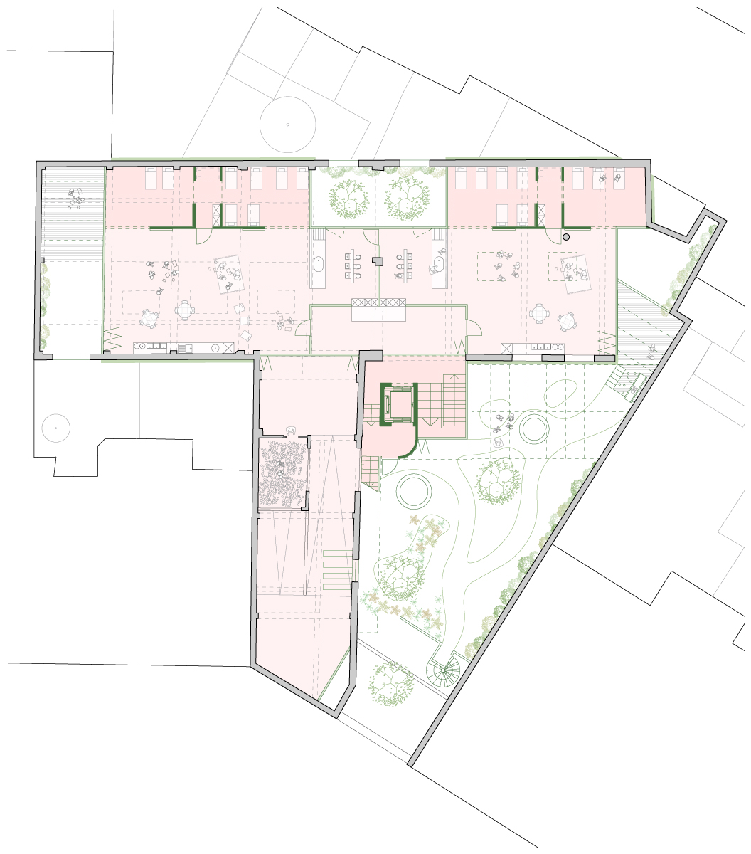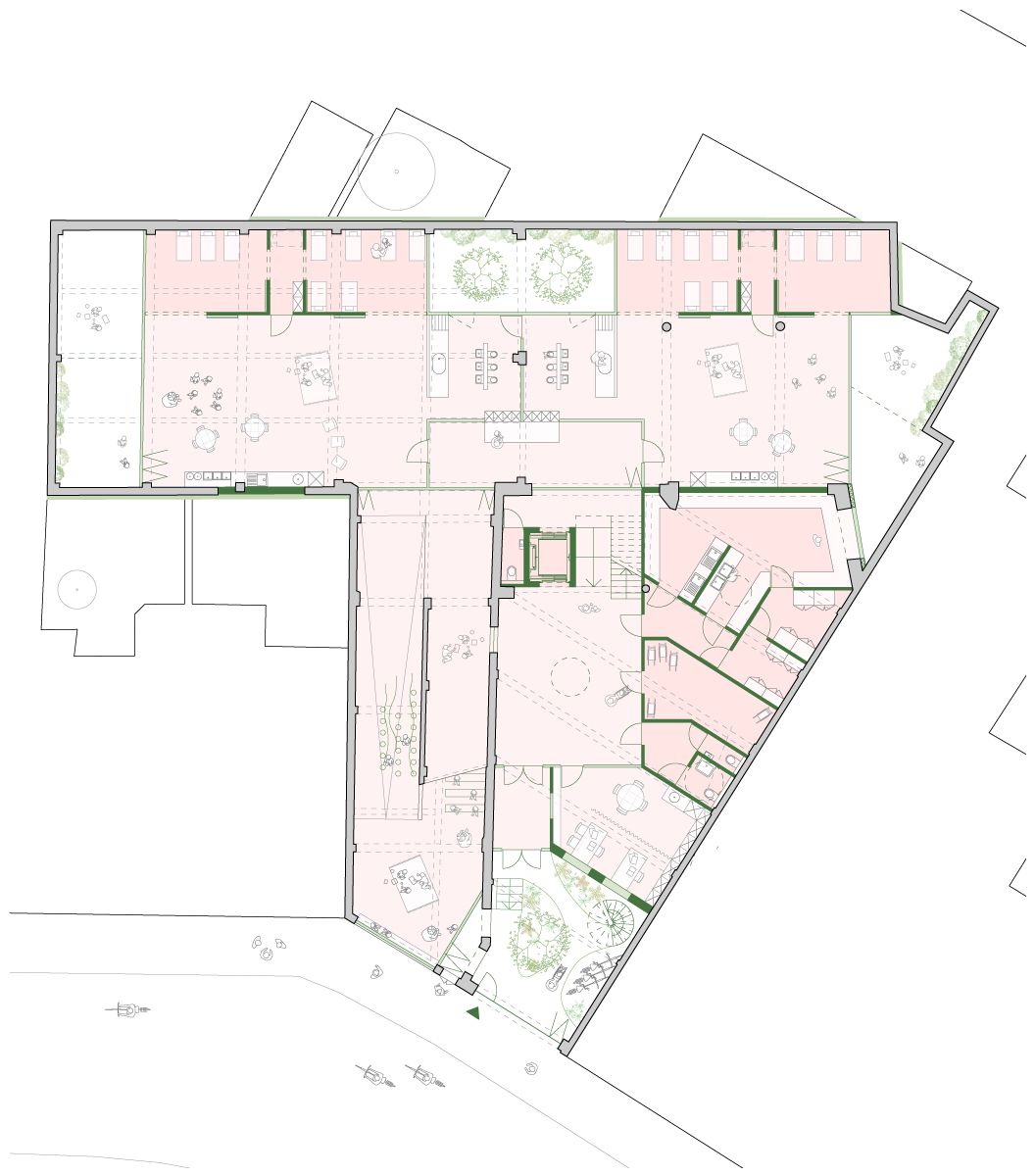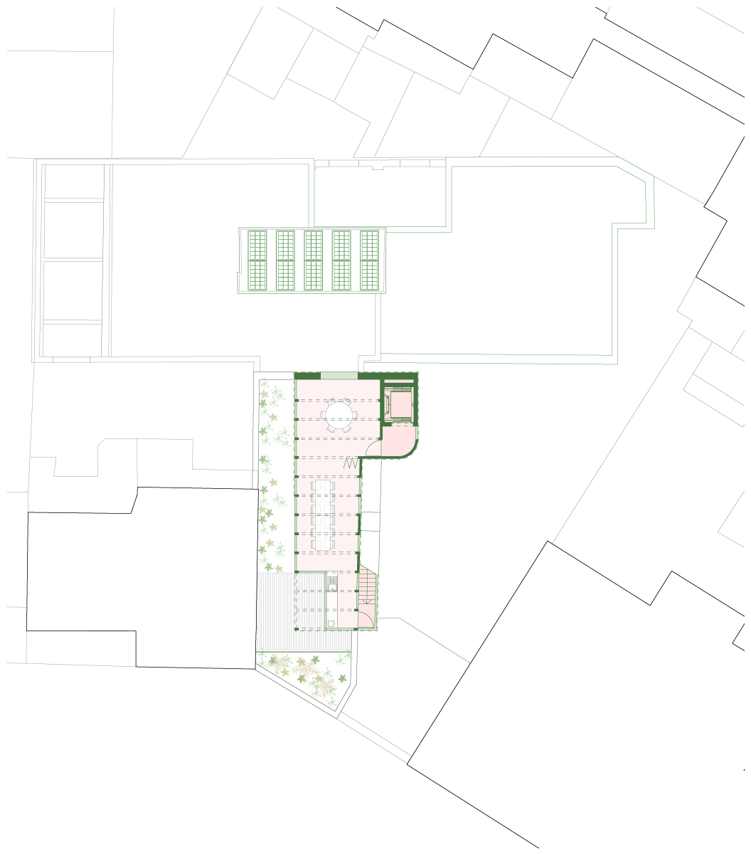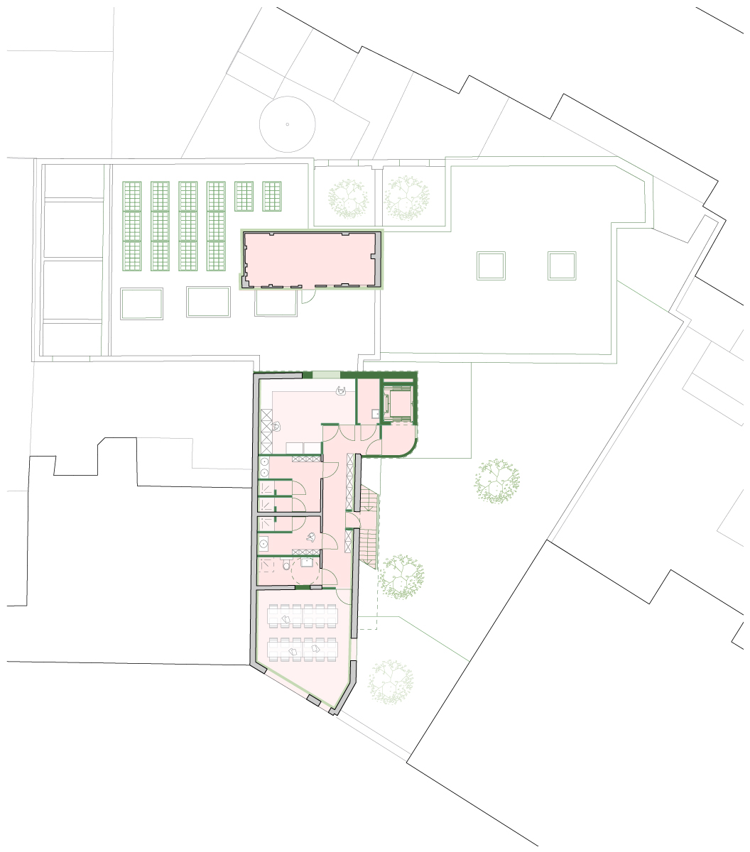 Het bestaande gebouw en de bestaande structuren worden maximaal behouden. Enkel daar waar het noodzakelijk is om licht, lucht en groen in de ruimtes te brengen, worden openingen in het bestaande gebouw gemaakt, steeds binnen de bestaande structurele logica. Op de plaatsen waar structurele of ruimtelijke toevoegingen noodzakelijk zijn, wordt er enkel gebruikt gemaakt van duurzame materialen.