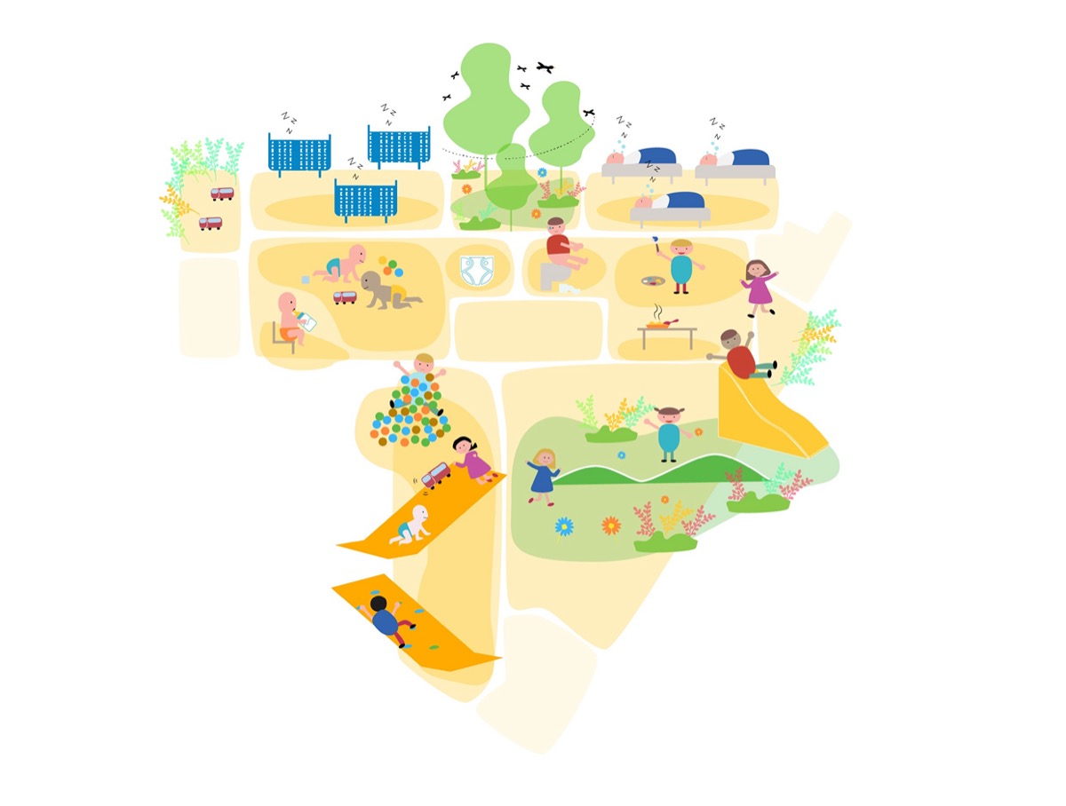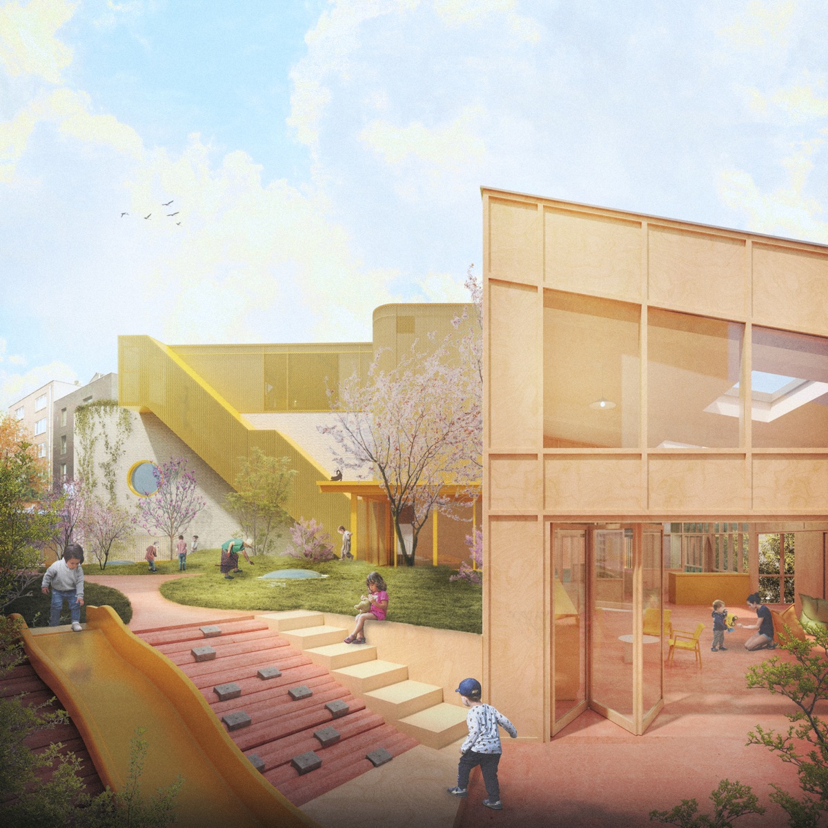 De wijk is een dichtbevolkte, dense wijk met weinig groen. De aanwezige openbare ruimtes bieden daarnaast weinig speelruimte voor kinderen. OFFICEU en OSK-AR voorzien in hun ontwerp dan ook een veelheid aan kwalitatieve groenruimtes en een diversiteit aan prikkelende bewegingsruimtes. Ze creëren een plek waar kinderen zich kunnen uitleven, waar er groene buitenruimte is om te ravotten, om op ontdekking te gaan. De architecten zoeken daarbij naar een subtiele interactie met de buurt, waarbij het ontwerp de mogelijkheid in zich draagt om groenruimte en bewegingsruimte in beperktere of grotere mate open te stellen voor de wijk.