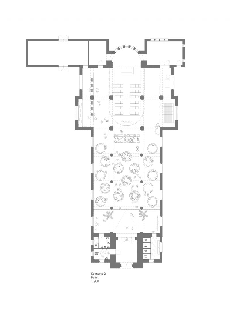 “Ondanks onze poging om niet medeplichtig te zijn aan bouwen van toekomstige leegstand, maar eerder een oplossing te zoeken voor de bestaande overmaat, mochten we de beslissing ontvangen dat er alsnog gekozen wordt voor de realisatie van het nieuwe ontmoetingscentrum. Ontwerpwedstrijden laten vaak weinig ruimte voor progressieve inzichten, vaak zijn er te veel drempels of weerstanden om terug te komen op beslissingen. Na een korte terugkoppeling begrepen we dat de kolommen in de kerk ook fysiek - of misschien nog meer mentaal– de realisatie van het programma in de kerk in de weg staan. Al geloven we dat onze eerste snelle schetsen aantonen dat deze drempel overwonnen kan worden. Een oplossing voor de transitie van deze Vlaamse parochiekerk is bij deze alvast een werk voor morgen, al is een functie als een ontmoetingscentrum een uitgelezen kans om het gebruik in de toekomst te bestendigen.”