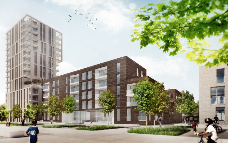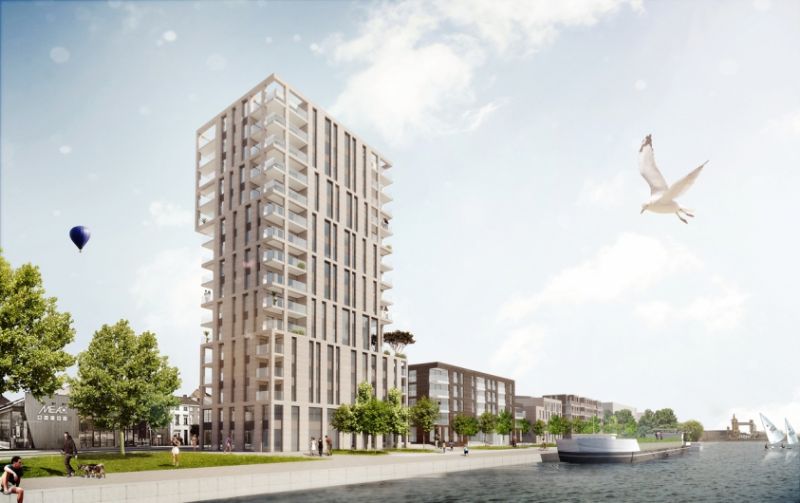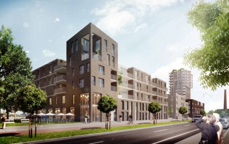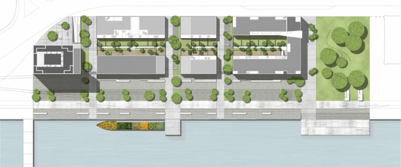 DDS & Partners Architects: "Het project treedt in dialoog met zowel het historisch stadscentrum als met de dokken. Langs de stadsboulevard en de waterkant vormen twee parallelle woningrijen nieuwe gevelfronten met een uitgesproken stedelijk karakter. Ze eindigen in een torengebouw. De woningen beschikken over kalme en zonnige private tuinen en terrassen aan de binnenkant van het bouwblok."