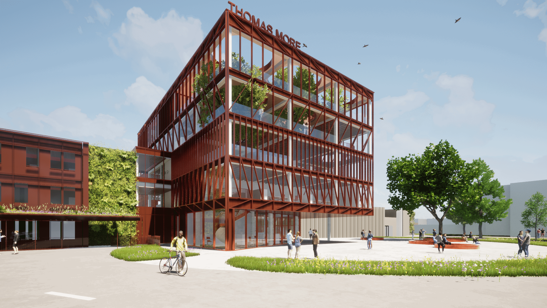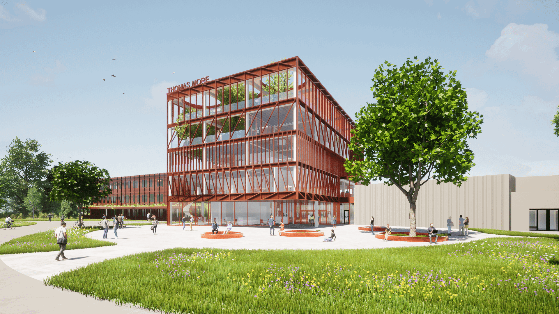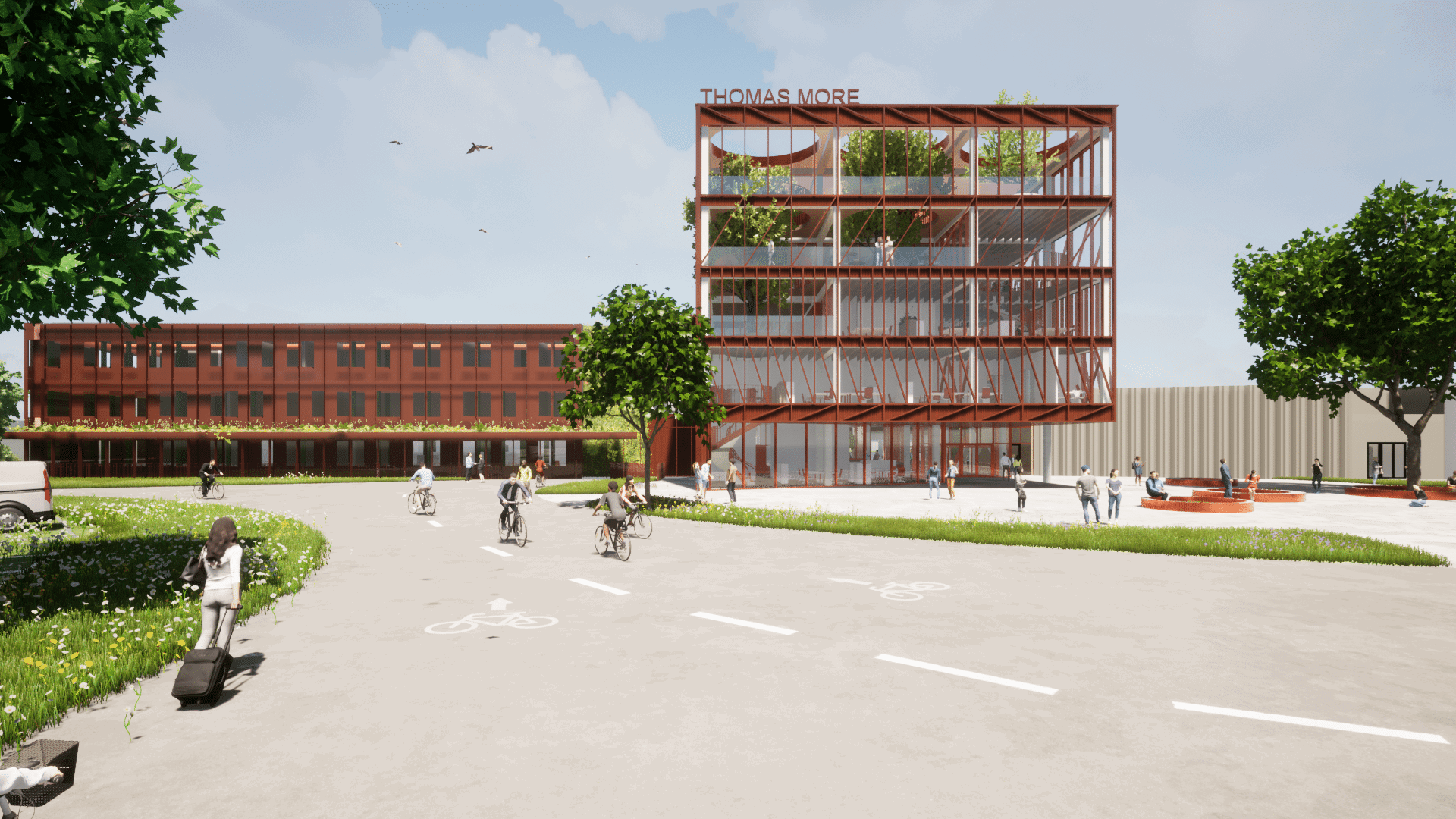 Het nieuwe hoofdgebouw moet de ‘smoel’ van de campus worden, een duidelijk en architecturaal gezicht van Thomas More dat de visie en uitstraling van de school vertegenwoordigt en de hoofdinkom accentueert.