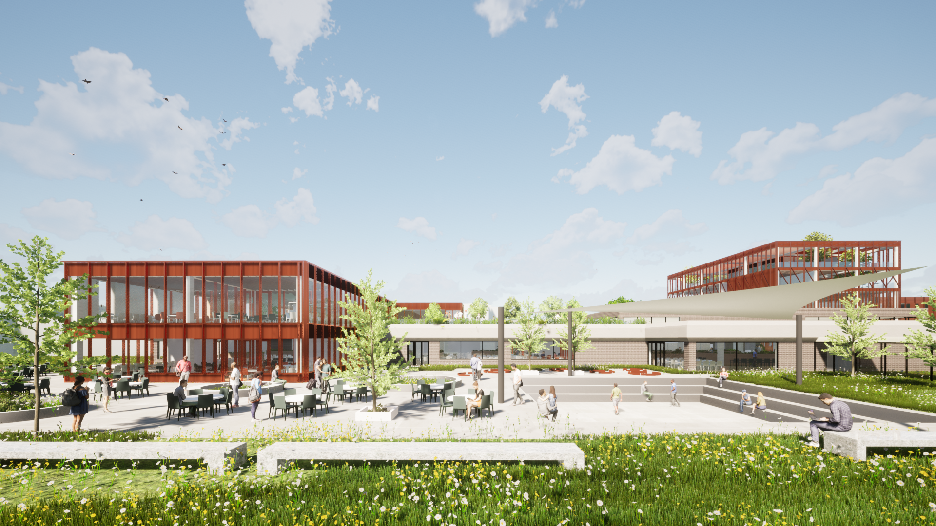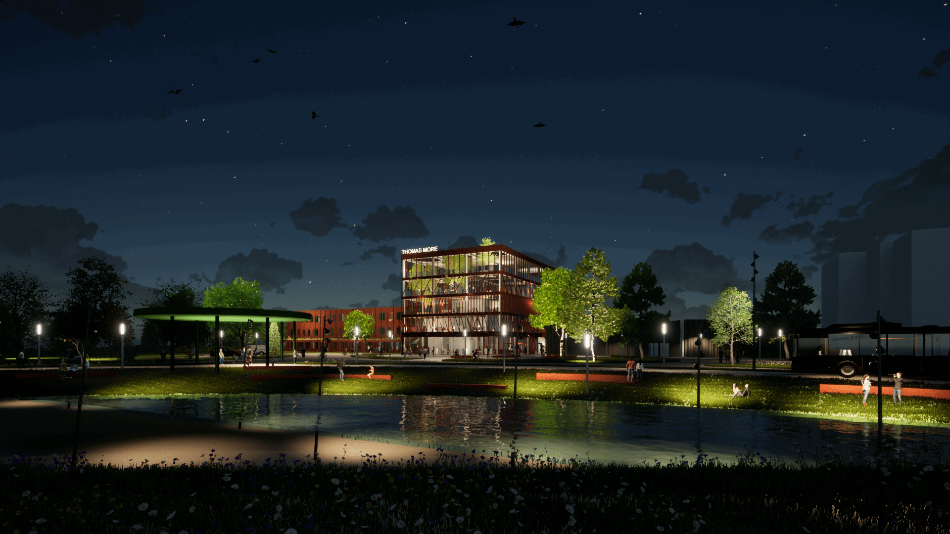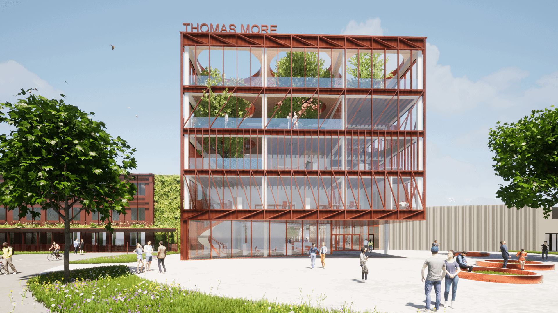 Het nieuwe hoofdgebouw moet de ‘smoel’ van de campus worden, een duidelijk en architecturaal gezicht van Thomas More dat de visie en uitstraling van de school vertegenwoordigt en de hoofdinkom accentueert.