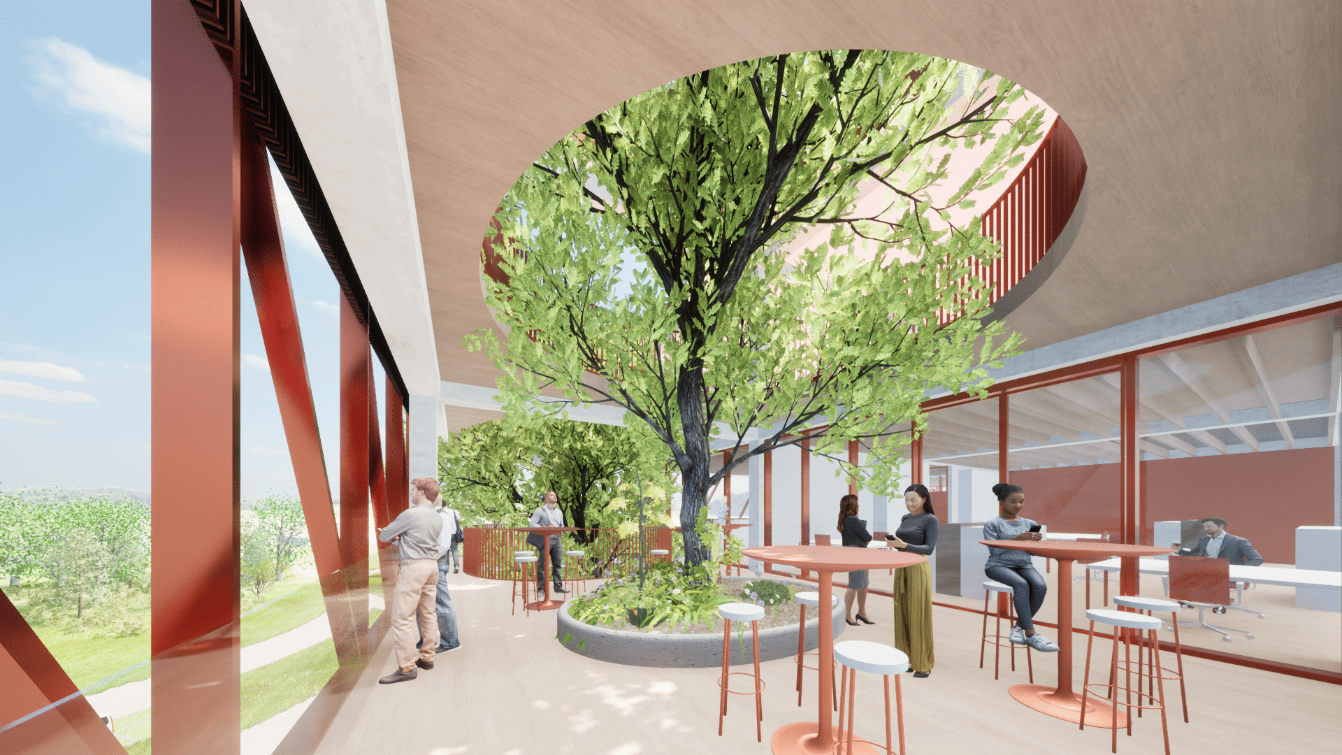 CLVR koos voor een transparant volume van vijf bouwlagen met rode accenten, hetgeen refereert naar de kleur in het logo. Op doordachte plaatsen worden binnen en buiten ronde openingen gemaakt tussen de verschillende niveaus om relaties tussen de verschillende functies te creëren. Aan de terrassen worden de openingen gevuld met groen. De circulatie en structuur van het gebouw is zuiver en vloeit voort uit de reeds aanwezige structuur van het gebouw waar tegenaan gebouwd wordt.