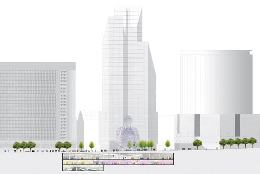 BUUR:"Het ontwerp verbindt en negotieert tussen de verschillende stromen en verleent het plein een nieuwe identiteit. Waar wij The Human Body hadden geplaatst, voorziet dit ontwerp de patio te overdekken tussen boven- en ondergrond door een grote, ronde stalen luifel."