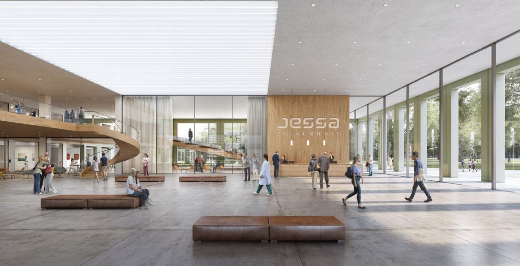 Van begin af aan heeft ons team de kosten als belangrijke factor meegenomen in alle overwegingen. Dit is naar de bouwheer en samenleving een verantwoord verhaal, zeker gezien de toename van zorgkosten in het algemeen. Er was door het Jessa Ziekenhuis ook een budget vastgesteld. Dit sloot in onze ogen een grote ondergrondse parkeergarage en hoogbouw uit vanwege de navenante uitvoerings-, funderings- en veiligheidskosten. Consequentie was wel een grotere impact op de site doordat de footprint toeneemt en parkeeroplossingen bovengronds gezocht moesten worden. Deze aspecten hebben we in balans met het landschap ingepast. We hebben intern een discussie gehad over het wel of niet toepassen van hoogbouw om deze impact te verkleinen maar kwamen tot de conclusie dat een toren een verouderd ziekenhuistype is dat zich vaak moeilijk laat inregelen en aanpassen. Daarnaast wilden we garanderen dat iedereen, van chirurg tot kok en patiënt zicht heeft op het directe groen rondom en de geluiden in het park kan horen. Deze sensibiliteit is onderdeel van de healing environment.