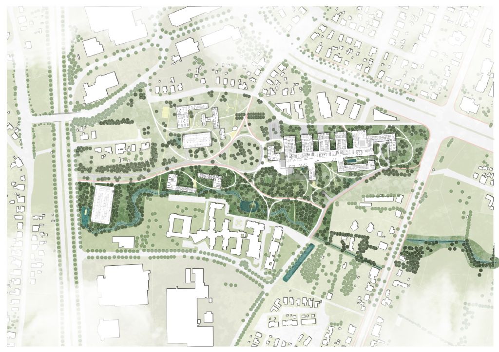 Vorige week raakte bekend dat het team bestaande uit Robbrecht en Daem architecten, Osar, Blauwdruk Stedenbouw, LAMA landscape architects en Tractebel-Engie – Transport & Mobility Leuven de ontwerpwedstrijd heeft gewonnen voor het nieuwe Jessa Ziekenhuis in Hasselt. Bij elke ontwerpwedstrijd zijn er helaas ook verliezers die het net niet gehaald hebben. Zonde van de tijd en de creativiteit die daarin kroop. Om deze ontwerpen toch de aandacht te geven die ze verdienen, vroeg architectura.be aan de andere andere teams die de selectie van de Open Oproep voor het Jessa Ziekenhuis haalden, om hun ontwerp hier voor te stellen. Voor KAAN Architecten, Wiegerinck Architecten, LOW Architecten, B+B Landschapsarchitecten, Ingenium, Ney & Partners, Sureal, Antea, Witteveen + Bos, The Middle Men draagt het Salvatorpark een holistische duurzaamheidsvisie uit die gaat om het maken van een flexibel en aanpasbaar gebouw in een helende en gezonde omgeving.