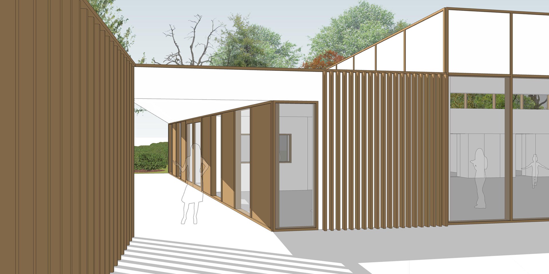 Het ontwerp van 2PK Architecten vertrekt vanuit de bijzondere ligging van het college, genesteld in een groene omgeving tussen de Brusselsesteenweg en de Schelde. Het programma werd ondergebracht in vier clusters, afgestemd op hun functie en de oriƫntatie van het terrein. De administratieve cluster bevindt zich bij de oprit in het oosten, de leraarskamer grenst aan de tuin in het zuiden, de zorgklassen en polyvalente leslokalen zijn strategisch geplaatst bij de speelplaats in het westen, en de speelruimte kreeg een plek in het noorden, nabij de sanitaire voorzieningen. Cruciaal in de ontwerpstrategie was het behoud van een ruime speelplaats en respect voor het geklasseerde hoofdgebouw.