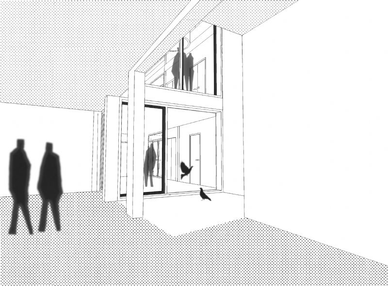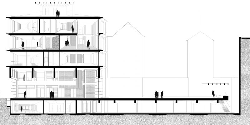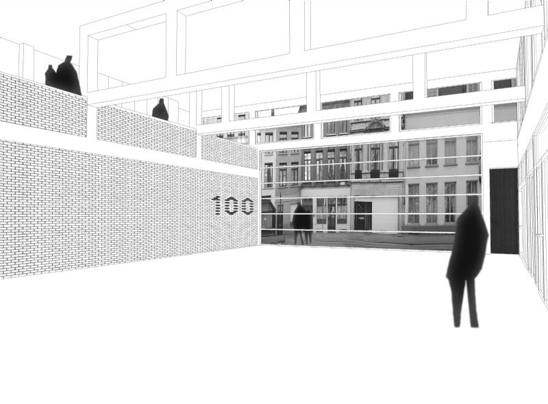 In het bouwblok sluit de kavel van de brandweer volledig aan bij de logica van grotere (woon)gebouwen op forse kavels. We stelden voor om de bestaande achterbouw integraal te verwijderen om zo het bouwblok te ontpitten. Vanop straat tot achterin het perceel opteerden we voor een continu doorzicht dat eindigt in een infini.
