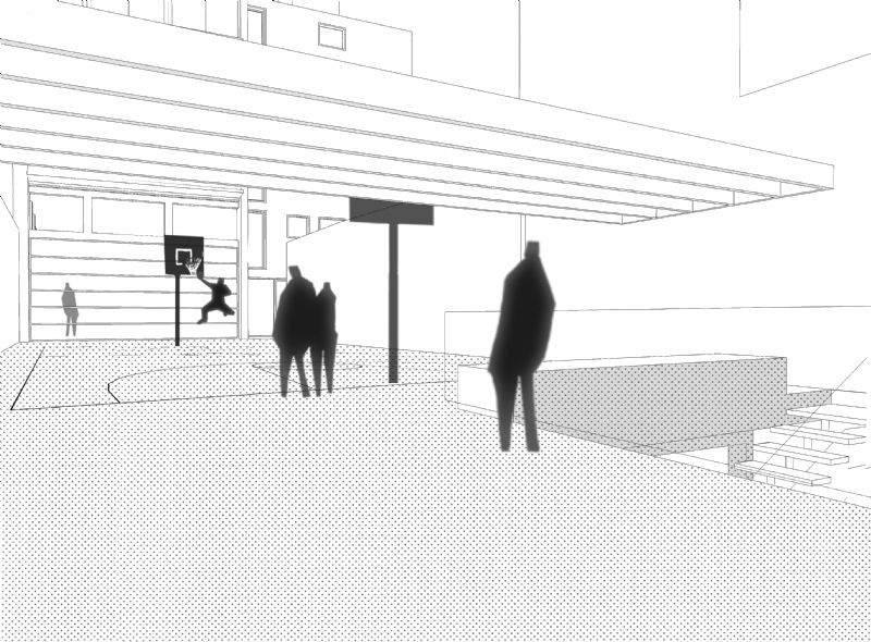 Het gebouw destijds werd gekenmerkt door een generieke stapeling van ‘typical plan’-verdiepingen, waarbij de traphal de enige verticale verbinding verzorgde. De bewoners van de brandweerpost zijn een ultiem op elkaar ingespeelde ploeg. Ze dienen op de hoogte te zijn van elkaar. Door het chirurgisch doorprikken of deels wegsnijden van de bestaande vloerplaten ontstonden nieuwe relaties tussen de verschillende programmaonderdelen. Enkele fijne en grondig bemeten ingrepen verrijkten de belevingswaarde en identiteit van de verschillende ruimtes en van het gehele gebouw. We zochten een andere samenhang, een betere routing en hiërarchie tussen de lokalen. Op de benedenverdieping werd het bestaande bos kolommen geamputeerd en vervangen door onderspannen vakwerkliggers om de grote wagens te kunnen stallen.