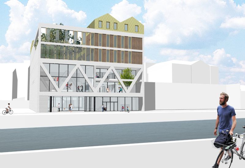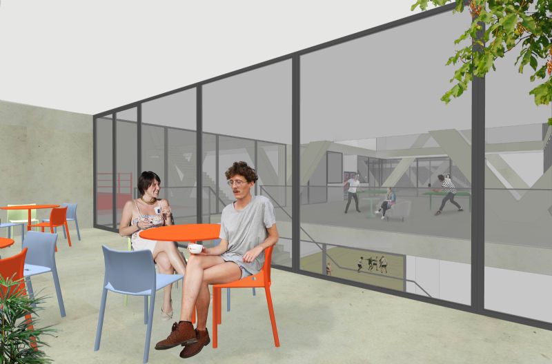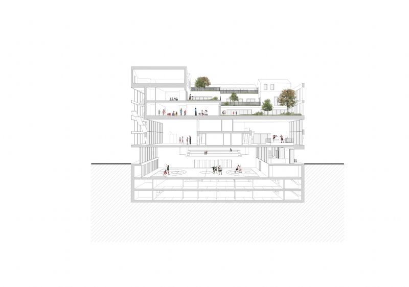 Cuypers en Q: "Onderaan zijn de ondergrondse garages geplaatst met daarop een verdiepte grote sporthal. Deze is zichtbaar vanop het maaiveld en zorgt ervoor dat het gelijkvloers volledig open blijft. Met een doordachte constructie kunnen we het gelijkvloers overspannen: de grote liggers geven karakter aan de verdieping en zorgen voor vrij plan eronder. Op de eerste verdieping bevinden zich de bokszaal en de polyvalente sportzaal. De open en publieke ruimte verbindt alle ruimten en door middel van doorzichten zijn de functies visueel met elkaar verbonden. Boven op de sportinfrastructuur plaatsten we de beide crèches. Beiden zijn voorzien van grote, goed georiënteerde daktuinen. Als bekroning plaatsten we de woonfunctie op het dak en breidden deze functie uit met mogelijke huurwoningen. Deze enclave op het dak zou zorgen voor een extra sociale controle en een mix als reflectie van de stad op het gebouw. Wij kozen ervoor een transparant gebouw te maken, leesbaar vanuit de wijk en vanaf het kanaal, waarbij we de sociale interactie bevorderen door een diagonale routing en door doorzichten te voorzien in het geheel van het complex. We wilden alle bewoners van Sint-Jans-Molenbeek betrekken bij het project."