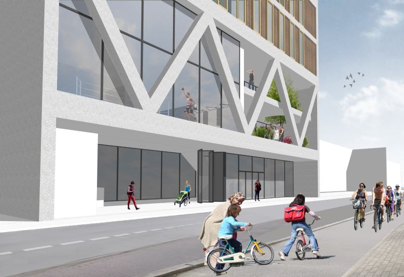 Cuypers en Q: “Wij vinden dat we erin geslaagd zijn om de complexiteit van de stad te vakken in één gebouw; de verschillende culturen, mensen, gebruikersgroepen worden uitgenodigd samen het gebouw te gebruiken als een verticale stad. De interactie die in een dorpslandschap normaal horizontaal verloopt, zou nu verticaal verlopen. Een sterk punt volgens ons is ook het feit dat wij een transparante gebouw zouden kunnen creëren. Je ziet de mensen sporten, je ziet de mensen circuleren in het gebouw vanuit de wijk én vanaf het kanaal. Bovendien zijn we er in geslaagd om extra woningen te creëren; conceptueel vinden we dat sterker, en anderzijds hebben we door een slimme stapeling en doordachte keuzes hiervoor budget kunnen vrijmaken."