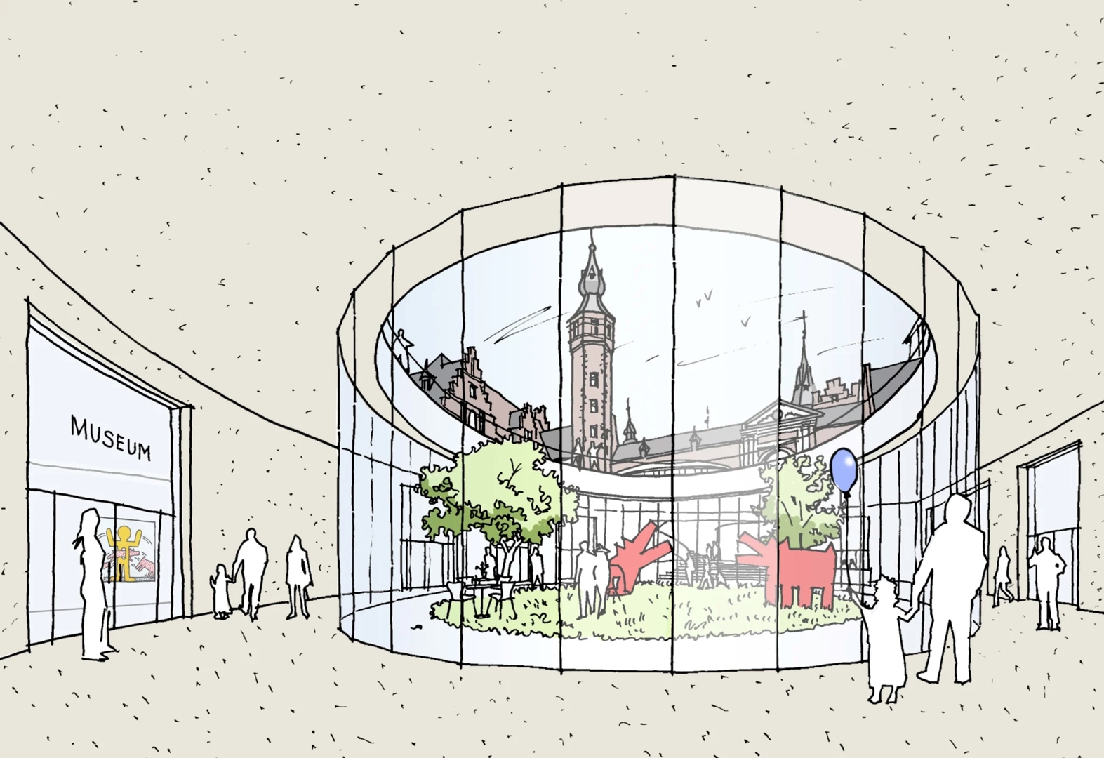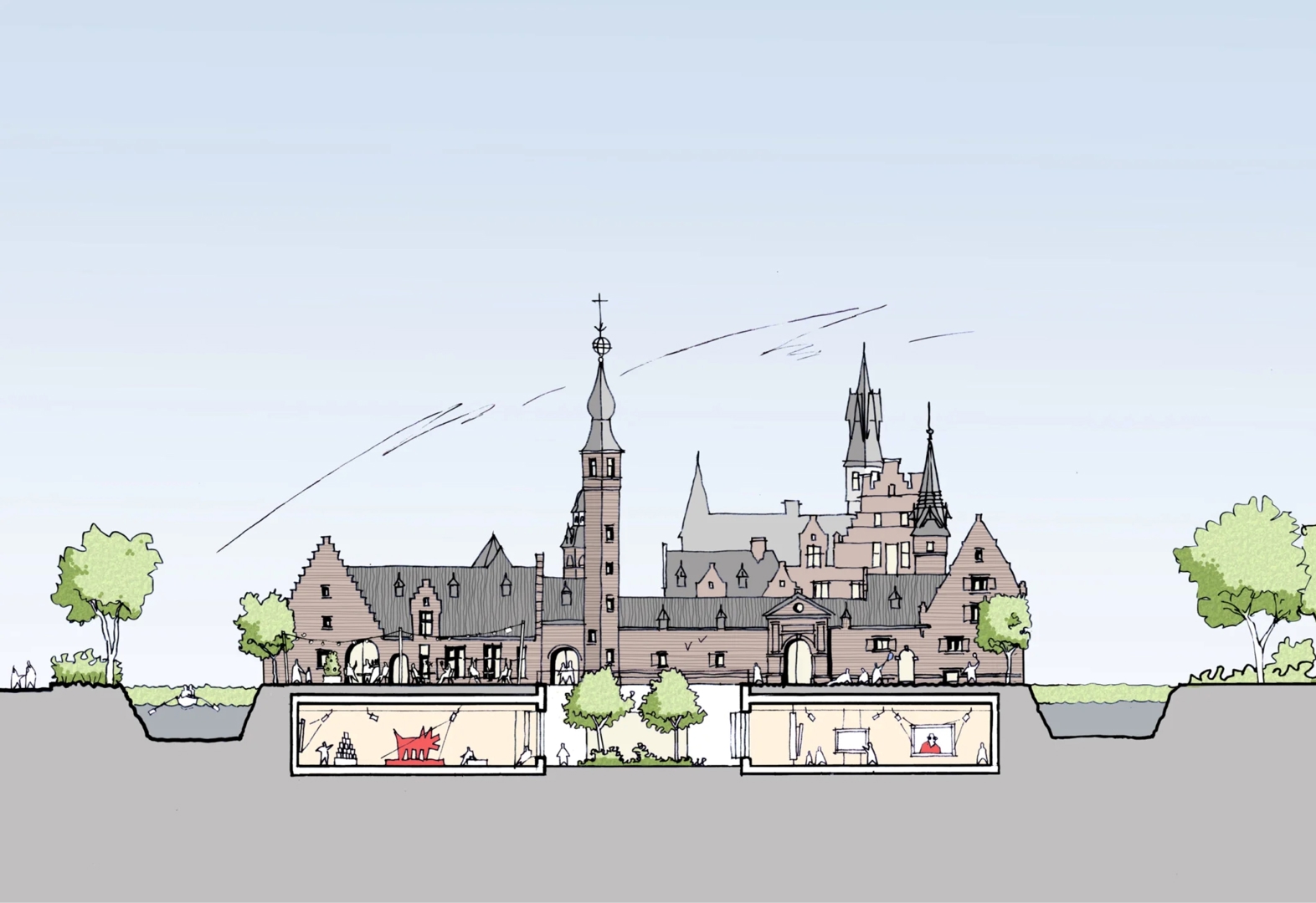 Omdat het bestaande gebouw niet geschikt is voor een volwaardig museum, voorziet het ontwerp in een subtiele, verzonken uitbreiding die zich discreet in het landschap voegt. Hierdoor blijft het silhouet van het kasteel onaangetast, terwijl de nieuwe functies op natuurlijke wijze worden geïntegreerd. “We kiezen bewust voor een verfijnde en subtiele ingreep om het erfgoed en het bestaande Sterckshof optimaal tot zijn recht te laten komen,” zegt Carl Meeusen van Neutelings Riedijk Architects. De dialoog tussen oud en nieuw vormt de kern van de ontwerpfilosofie: verleden en toekomst vloeien naadloos in elkaar over.