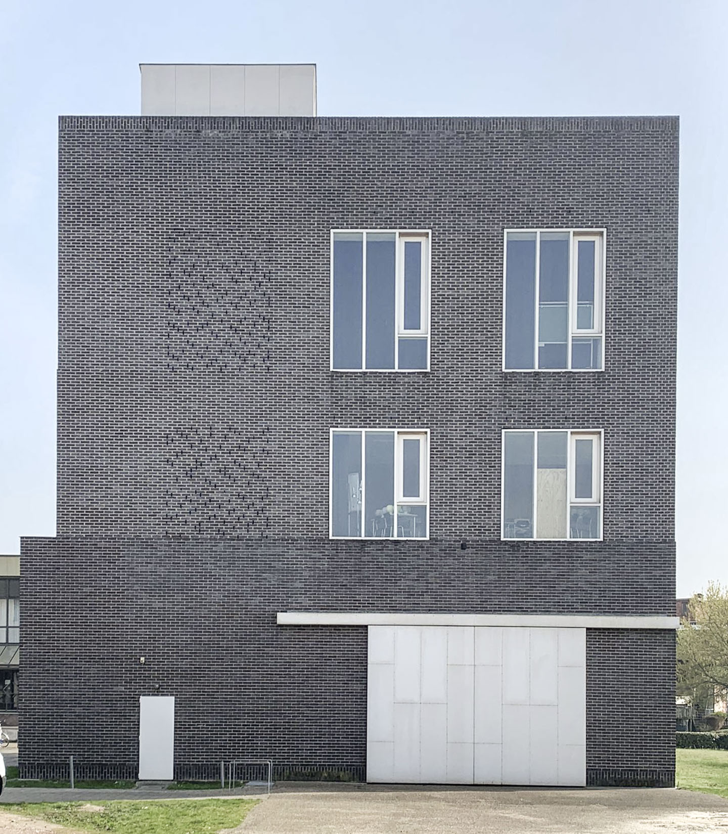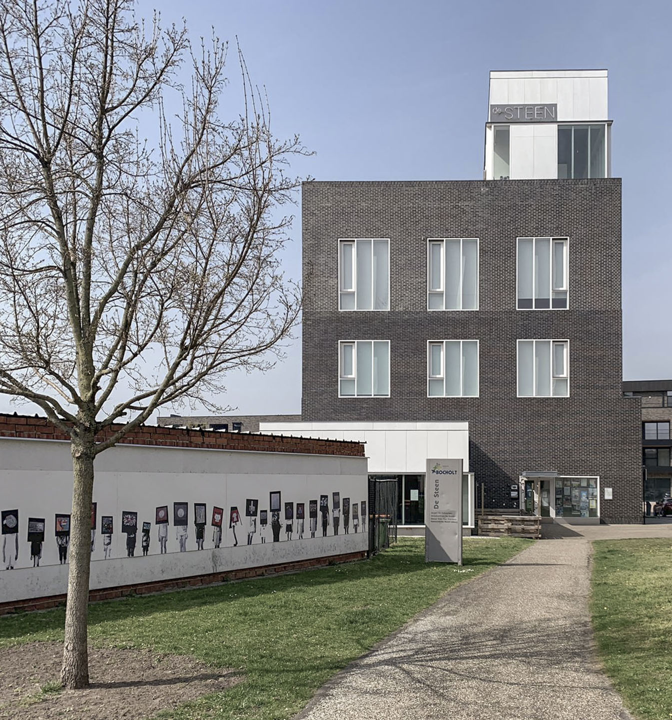 De Steen bevindt zich achter het gemeentehuis. Een verhard pad leidt naar het polyvalent gebouw. In het wit volume op niveau 0 vinden we het jeugdlokaal. Het wit volume op niveau 4 verbindt het interieur van De Steen met het dakterras. Hier krijgen we een uitgerekt zicht over Bocholt. In het grote bakstenen volume bevinden zich nog enkele kernfuncties waaronder de muziek-, kunstacademie, de polyvalente zaal en de dienst voor vrije tijd te herbergen. Onderaan zien we een detail van de uitwerking van de gevel. Achter het claustra bevindt zich de buitentrap.