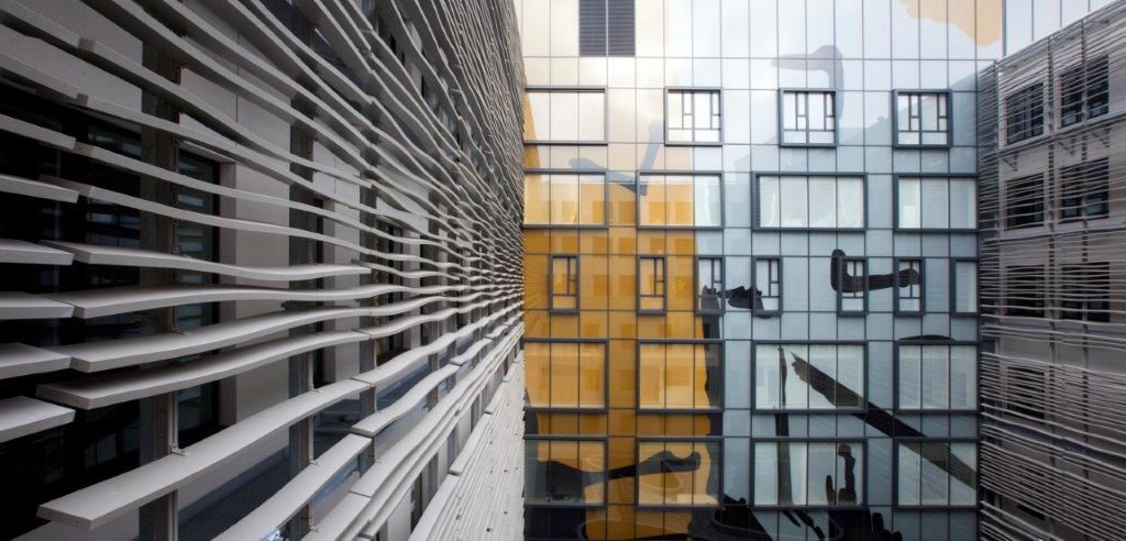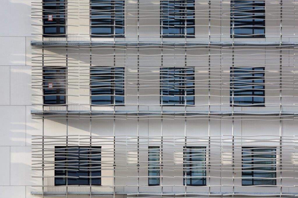 Dankzij deze doordachte indeling zou de zorgverlening in het nieuwe AZ Sint-Maarten perfect gestroomlijnd moeten kunnen verlopen. De ontwerpers van VK Architects & Engineers deden een beroep op de expertise van 46 specifieke werkgroepen binnen het personeelsbestand van het ziekenhuis. Dit resulteerde in enkele praktische optimalisaties, zoals kortere loopafstanden tussen de verschillende afdelingen. “Het functionele aspect was uiteraard belangrijk, maar ook aan de esthetiek van het geheel hebben we de nodige aandacht besteed”, benadrukt Debacker. “De buitenschil van het gebouw doet met zijn opvallende witte kleur dienst als sierelement, en in de vliesgevels is aan de hand van digitale prints een kleurrijk kunstwerk van Koen van den Broek verwerkt. Ook de zonwering – gebogen aluminium lamellen die zich quasi over de volledige breedte van het volume uitstrekken – draagt bij tot de architecturale beleving. De lamellen optimaliseren de daglichtinval via hun lichte inclinatie en maken een visuele golfbeweging die het gebouw een markante uitstraling geeft. Het ziekenhuis heeft met andere woorden een sterke identiteit, maar zal de patiënten tegelijk een warm thuisgevoel bezorgen.”