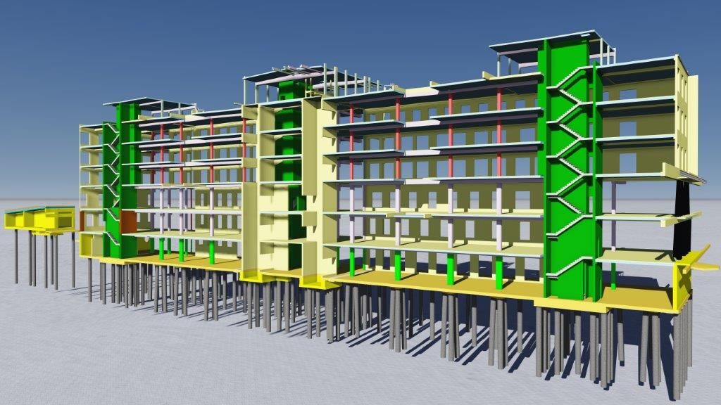 De imposante contouren van het nieuwe AZ Sint-Maarten zijn intussen grotendeels zichtbaar. De structuur van het complex bestaat quasi volledig uit prefab sandwichpanelen met betonnen binnenschil, isolatie en een architectonische betonnen buitenschil, aangevuld met trapkernen in stortbeton en prefab kolommen, balken en welfsels. “We hebben er alles aan gedaan om een economisch interessant gebouw te maken”, vertelt Sam Van den Wijngaert, projectleider en BIM-manager bij Sweco Belgium. “Zo hebben we geopteerd voor schuine funderingspalen, een ongebruikelijke oplossing die gezien de schaal van het project een belangrijk verschil maakt. Voorts is het grondverzet tot een minimum beperkt door de inplanting van het gebouw in verticale zin te optimaliseren. Gezien de grondwaterdruk was het geen sinecure om de kelderverdieping waterdicht te maken. Belangrijk om weten, is dat het ziekenhuis zodanig ontworpen is dat er mogelijkheden zijn om het op termijn uit te breiden (flexibele structuur). We hebben er vanuit stabiliteitsoogpunt rekening mee gehouden dat de constructie in de toekomst verder kan groeien – zowel in de hoogte als in de breedte.”