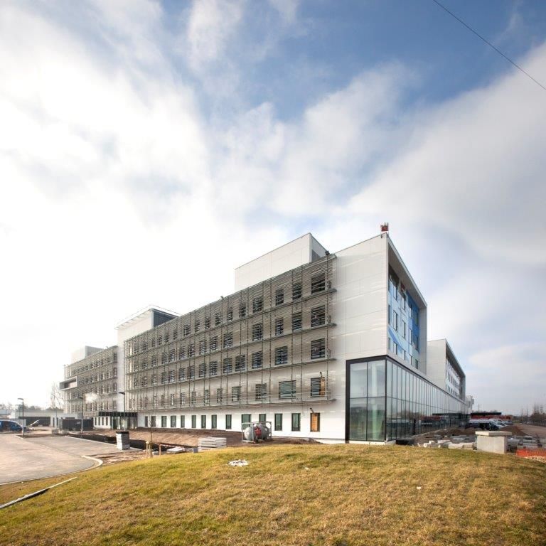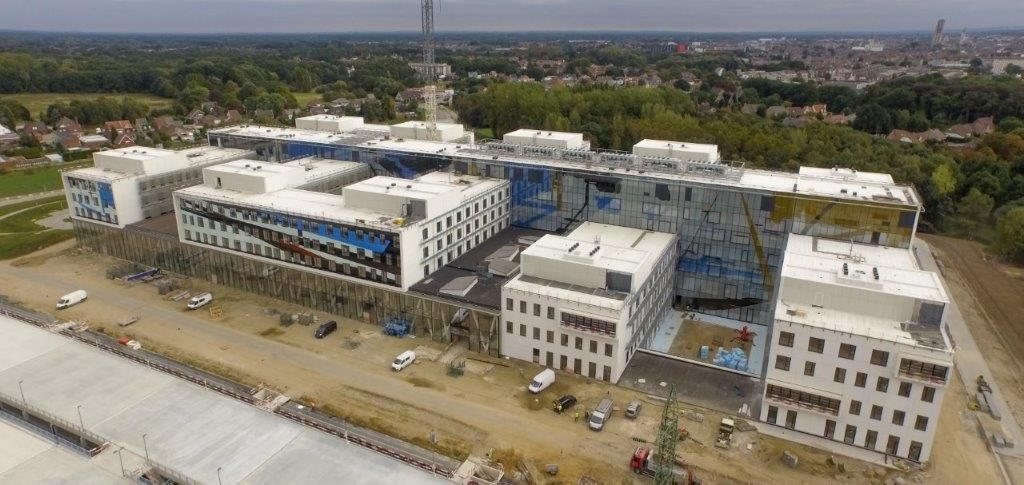 De bouw van het ziekenhuiscomplex is in oktober 2013 gestart en is anno 2017 al aardig gevorderd. De gesloten ruwbouw is wind- en waterdicht opgeleverd, het parkeergebouw is klaar, de buitenaanleg is volop aan de gang en zowel de interne afwerking als de installatie van de technieken vorderen met rasse schreden. De voorlopige oplevering van het geheel is voorzien voor eind 2018. “We zitten nog steeds perfect op schema”, bevestigt Marc De Decker, projectdirecteur bij ruwbouwaannemer MBG. “Voor het optrekken van de ruwbouw was een relatief korte bouwperiode van twee jaar voorzien. Het was een hele uitdaging om het project logistiek in kaart te brengen en alle materialen just in time te laten leveren. In het gebouw zijn maar liefst 17.000 prefab onderdelen verwerkt, die naargelang hun aard en toepassing besteld zijn bij verschillende leveranciers – een gigantische puzzel die perfect moest kloppen. Bovendien is het niet bepaald een repetitieve constructie en zaten we dus met een grote hoeveelheid unieke elementen. Daarnaast moesten we er uiteraard ook voor zorgen dat al het benodigde materiaal op het juiste tijdstip aanwezig was – op een gegeven moment stonden er maar liefst negen torenkranen op de werf.”
