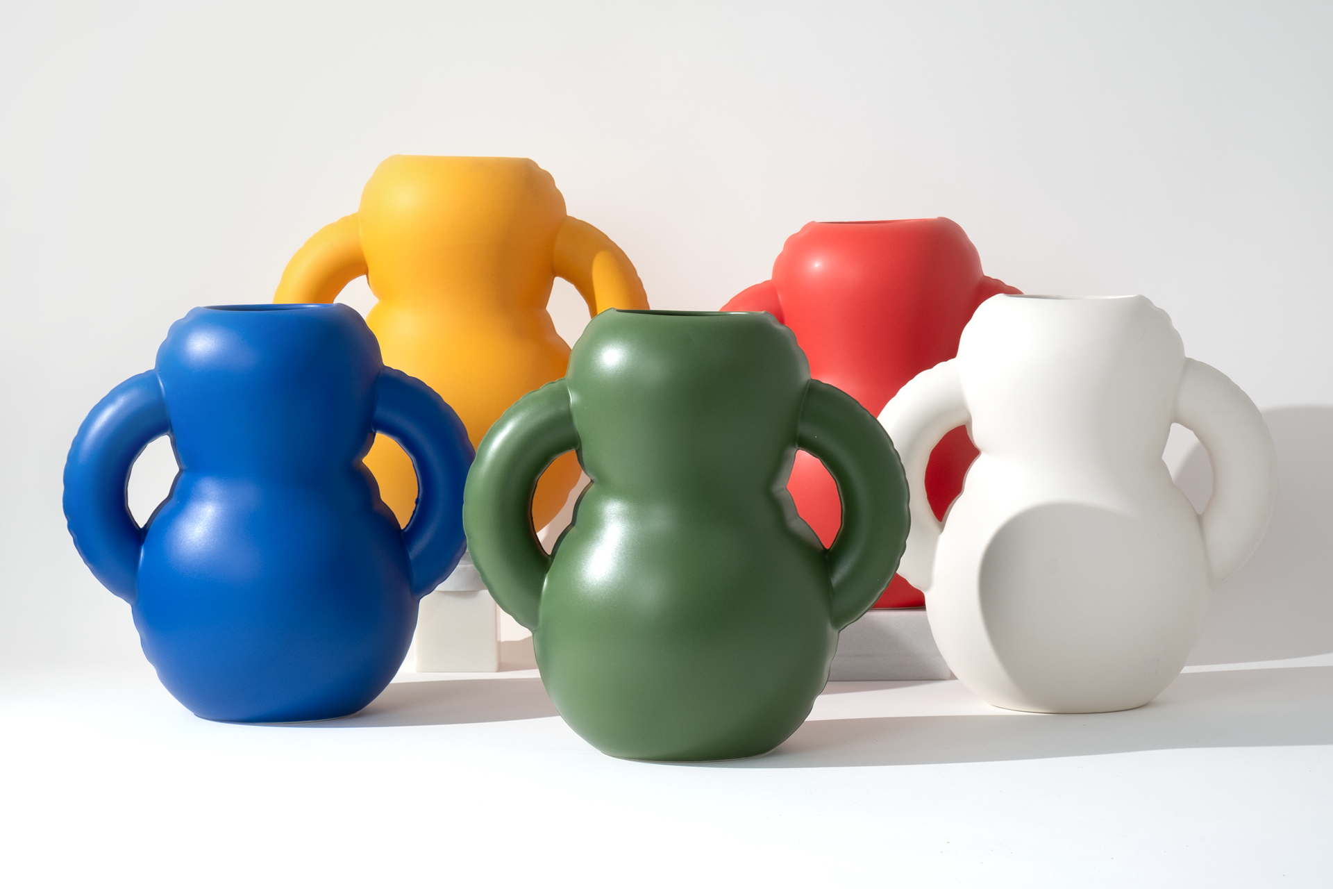 Qua vorm zijn de objecten direct herkenbaar als vazen, bloempotten, spiegels en karaffen. Maar dankzij de levendige kleuren en de speelse, vrolijke, tromp-l'oeil-achtige benadering van de opgeblazen keramiek, wordt er een nieuwe, tactiele dimensie toegevoegd. Ze nodigen uit om aangeraakt te worden, gebruikt te worden, om plezier te brengen in het dagelijks leven.