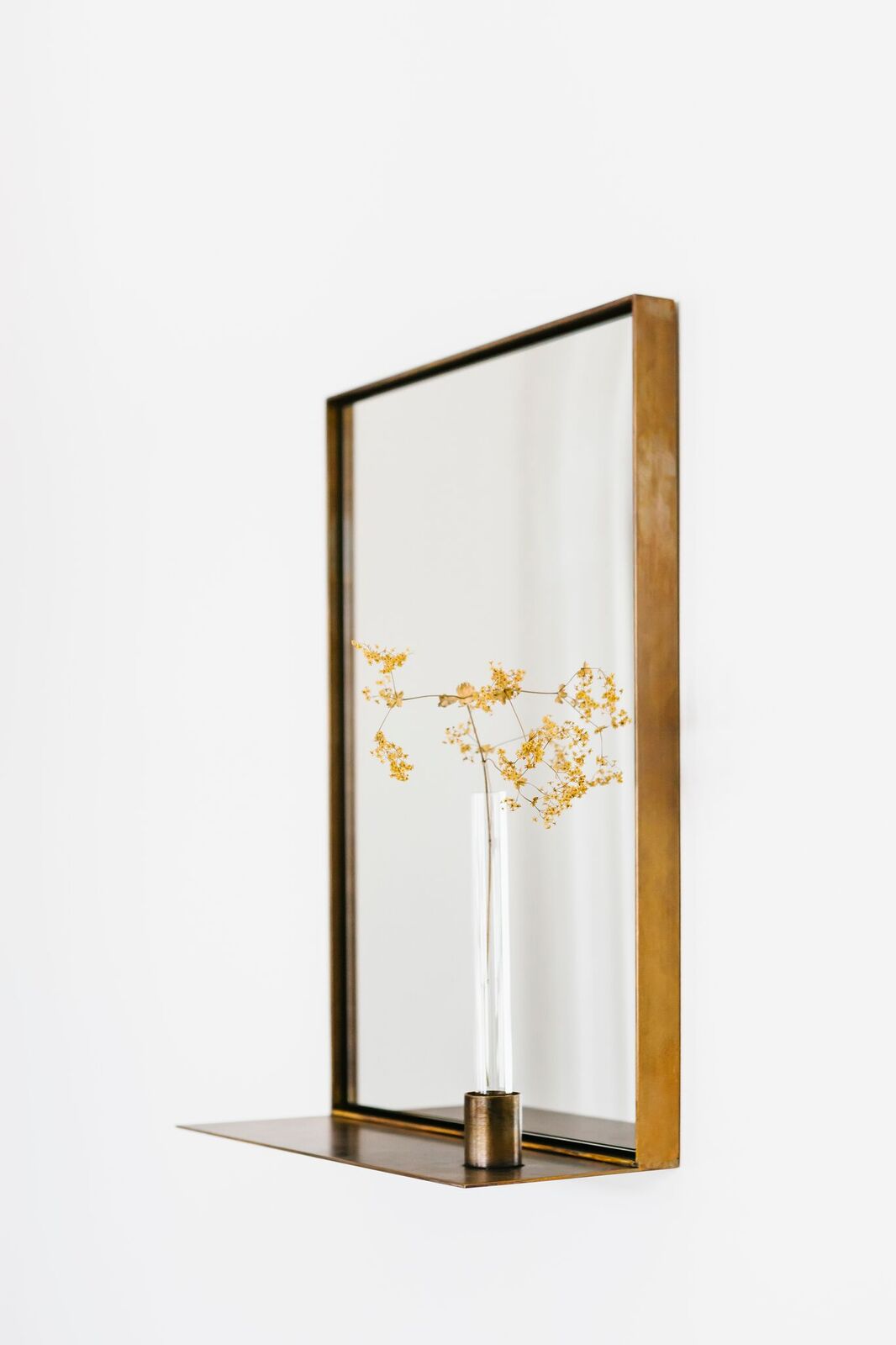 GEORGETTE is de eerste creatie van Illus. Een rechthoekige spiegel met handig plankje waarop een houder voorzien is voor een kaars of vaasje. Het is een nostalgisch detail dat de spiegel een romantisch kantje geeft, al past deze spiegel perfect in een hedendaags interieur. GEORGETTE is verkrijgbaar in messing en wordt geleverd met vaasje en kaars.