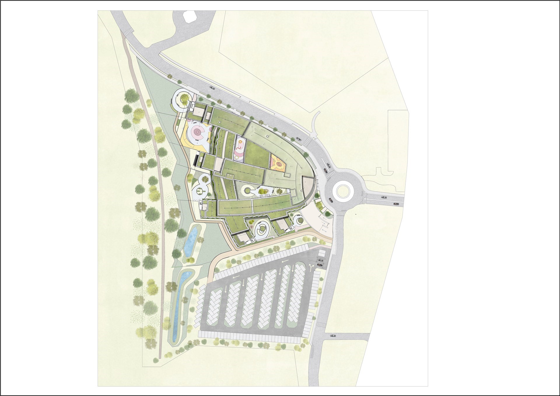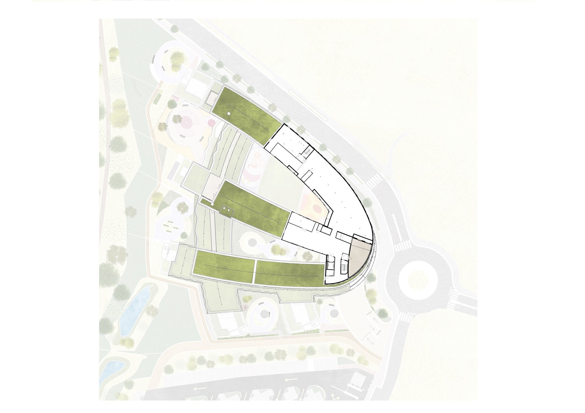 Het gebouw ligt aan de rand van een natuurgebied, de Woluwevallei. Het gebouw is zo ontworpen dat het zich in drie delen opent naar de vallei. Het groen van het dal wordt doorgetrokken in het gebouw. Alle kamers kijken uit op de omliggende natuur en hebben glas van vloer tot plafond, zodat het effect van licht, lucht en ruimte maximaal mogelijk ervaren wordt. Het gebouw zelf heeft een concave vorm, zodat elke kamer zijn eigen identiteit heeft en er een mooie, vloeiende gevel ontstaat die op een vanzelfsprekende manier onderdeel wordt van de omgeving.