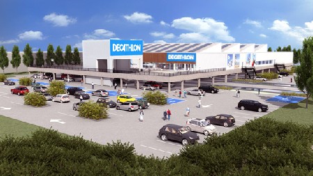 Een nieuwe centrale lichtgevende toegangstoren is de blikvanger van het gebouw. Hij bevat liften en trappen die de bezoekers de weg wijzen naar de Decathlonwinkel. Rondom de toren bevindt zich een sportieve playground die bedoeld is als een soort voorportaal. Om de bevoorrading te vergemakkelijken, werd een oprit aangelegd zodat er meteen op het niveau van de winkelvloer geleverd kan worden.