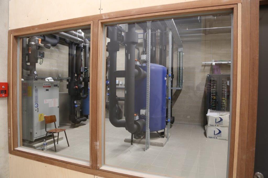 "Er is ook expliciet voor geopteerd om de leidingen en installaties maximaal in het zicht te houden. De technische ruimte bevindt zich in de nabijheid van de centrale inkom (ter hoogte van de trappenhal) en is voorzien van een binnenraam, zodat de leerlingen er een kijkje kunnen nemen, de technische infrastructuur met eigen ogen kunnen aanschouwen en de werking van het gebouw mee kunnen monitoren. Dat prikkelt hun leer- en nieuwsgierigheid.