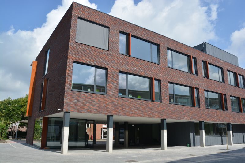 De uitbreiding van de school gebeurde aan de hand van twee volumes. Het ene volume is bijgebouwd op een bestaand gebouw en is bestemd voor administratie en klassen. Het klassenvolume krijgt dus dezelfde circulatie als het bestaand gebouw. Het andere volume is een nieuw gebouw met een eet- en sportzaal. Het nieuwe gebouw bevindt zich aan de straatkant van de site, waardoor deze constructie al snel als het ‘nieuwe gezicht van de school’ gezien wordt.