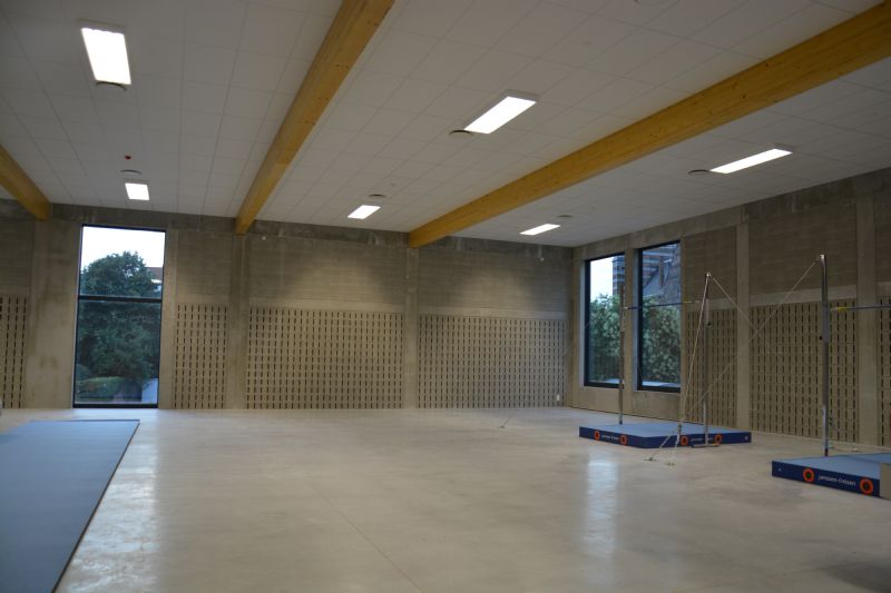 De grote sportzaal is uitgerust met akoestisch absorberende betonblokken. Die werden in een gestapeld verband gemetseld en opgevoegd. Samen vormen de blokken een nauwkeurig uitgetekend vlakkenspel met prefabbetonnen balken, wanden, en kolommen. De uitgebreide sport- en eetzaal en de ruime klaslokalen maken het Sint-Eduardusinstituut in Merksem een schoolvoorbeeld van een ‘brede school’.