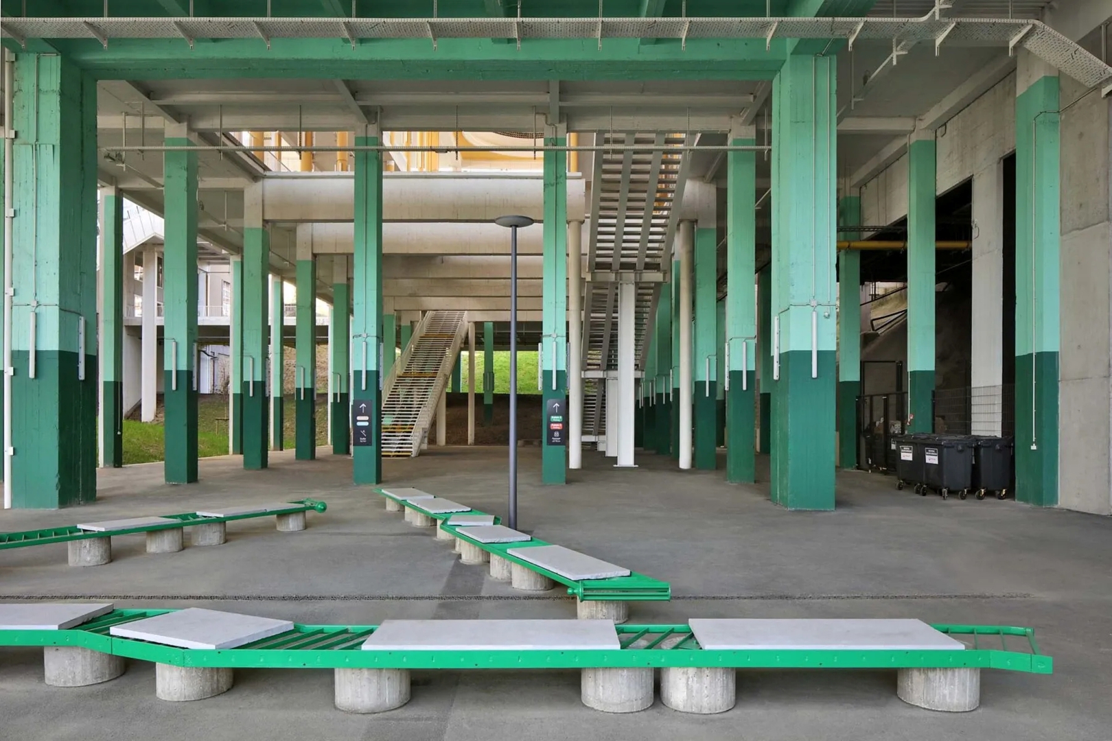 Waar Monnikenbos zich richt op een intieme zorgomgeving, vertelt het Grand Palais een heel ander verhaal. Het voormalige Palais des Expositions werd in 1954 gebouwd als symbool van Charleroi’s industriële kracht. In haar artikel voor Architectural Review schetst Audrey Contesse hoe dit imposante complex zijn functie verloor na de teloorgang van de mijn- en staalindustrie, en uiteindelijk decennialang leegstond. In 2014 werd het opgenomen in het stedelijke vernieuwingsplan Charleroi District Créatif. Een internationale wedstrijd in 2024 leverde de opdracht op voor AgwA en AJDVIV, die ervoor kozen de bestaande structuur te behouden en te transformeren in plaats van drastisch te slopen.