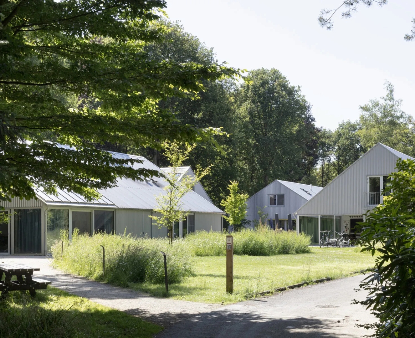 De ingrepen van UR architects zijn ingrijpend maar respectvol. Een nieuwe performante buitenschil bekleed met lichtgrijze golfplaat en royale glaspartijen maken de volumes licht en open, terwijl het merendeel van het beton en de baksteen behouden bleef om de continuïteit én het 'embodied carbon' te bewaren. De vroegere interne verbindingen tussen de woningen werden verwijderd en vervangen door een collectieve buitenruimte, waardoor de natuur letterlijk deel werd van het zorgconcept. Van Gerrewey benadrukt hoe de gesloten en ietwat benauwende architectuur van vroeger plaatsmaakte voor een omgeving die bewoners meer vrijheid geeft en het complex sterker inbedt in het landschap.