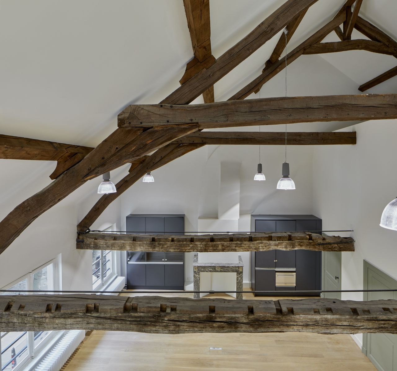 De restauratie van de dakstructuur ging gepaard met het aanbrengen van thermische isolatie en er is gekozen voor nieuwe dakpannen passend bij de dakvlakken van de omringende gebouwen. Tot slot werd ook de achtergevel aangepakt. Hier werd de oude koetsdoorgang vrij gemaakt, het baksteenmetselwerk werd bijgewerkt en de bepleistering werd opnieuw aangebracht volgens de oude technieken. Hiermee kreeg het pand een volledige opfrisbeurt waardoor historische elementen een nieuw leven werden ingeblazen opnieuw kunnen schitteren en hun functie vervullen in een prachtige werkomgeving.