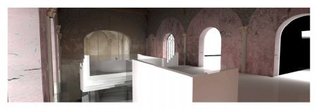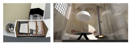 De glazen doos vrijwaart de oude muren van de kapel en zorgt bovendien voor een luchtig gevoel terwijl het te verwarmen volume beperkt blijft. De vloer van de kapel loopt bovendien naadloos door in het werkblad van het bureel. Om de nevenfuncties zoals sanitaire voorzieningen, een keuken en een archief te kunnen inpassen komt er een bijgebouw op een braakliggend stuk grond achter de kapel. De nieuwbouw wordt visueel losgetrokken van de oude constructie. Vormelijk moet de bouw lijken op een boomkapel. Door het nieuwe en het oude visueel van elkaar los te trekken, ontstaat een grote vide waarin trappen en loopbruggen de verticale circulatie en de verbinding tussen de ‘oude’ en de ‘nieuwe’ kapel verzorgen. Onder het dak van deze nieuwe constructie komt een slaapplaats voor toeristen of toevallige passanten.
